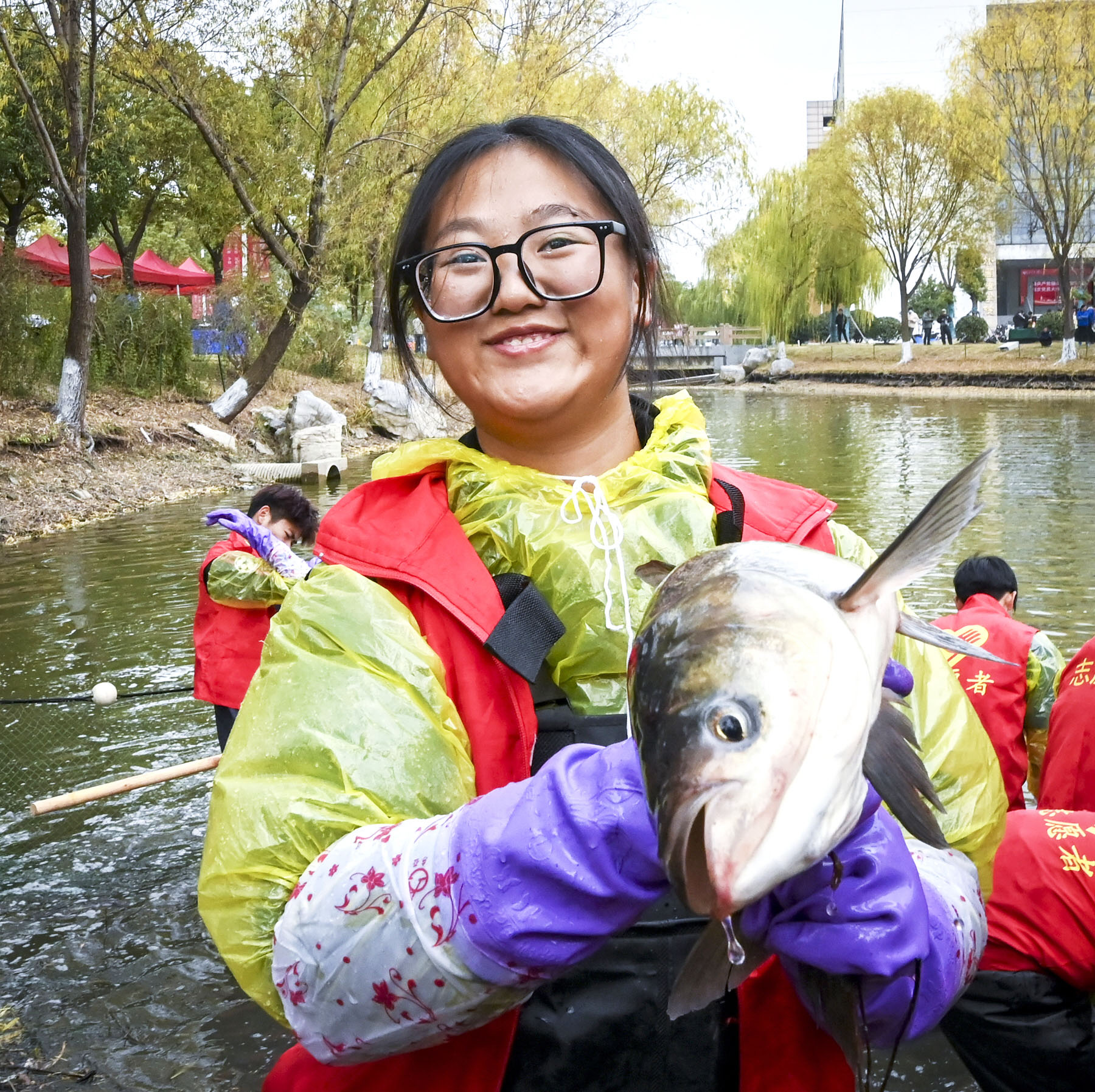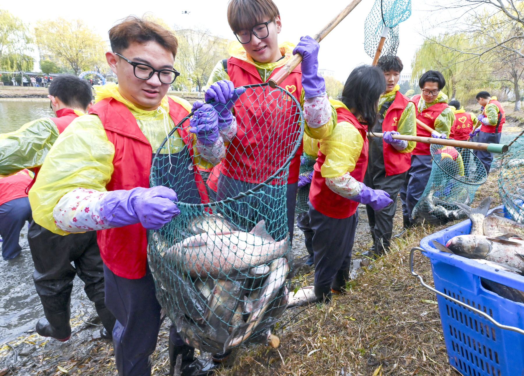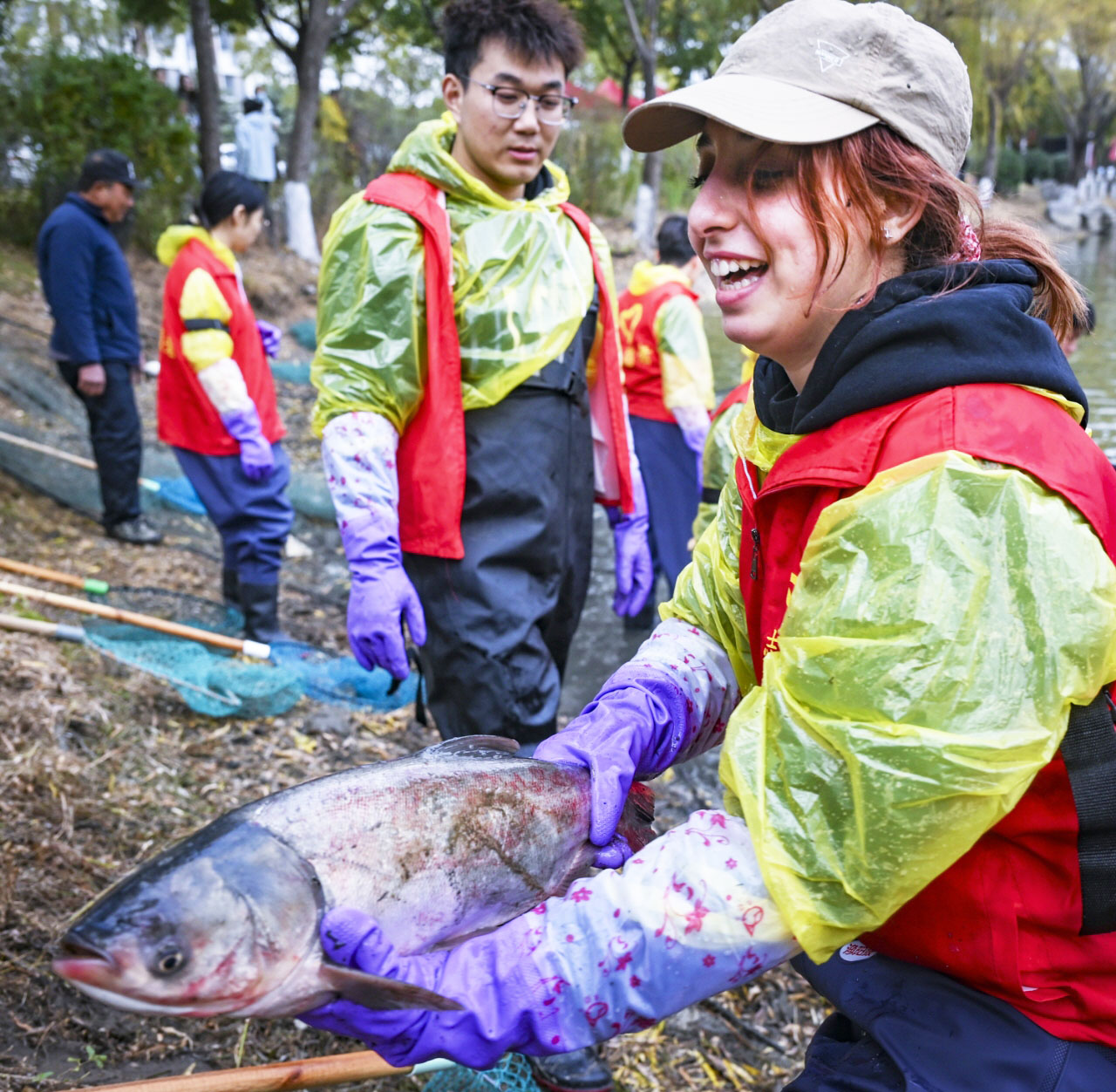 12月10日下午,扬州大学扬子津校区的朗月湖畔鱼跃人欢。扬州大学第六届捕鱼节如约而至,学生志愿者们热火朝天地捕鱼,外国留学生也沉浸式加入其中。