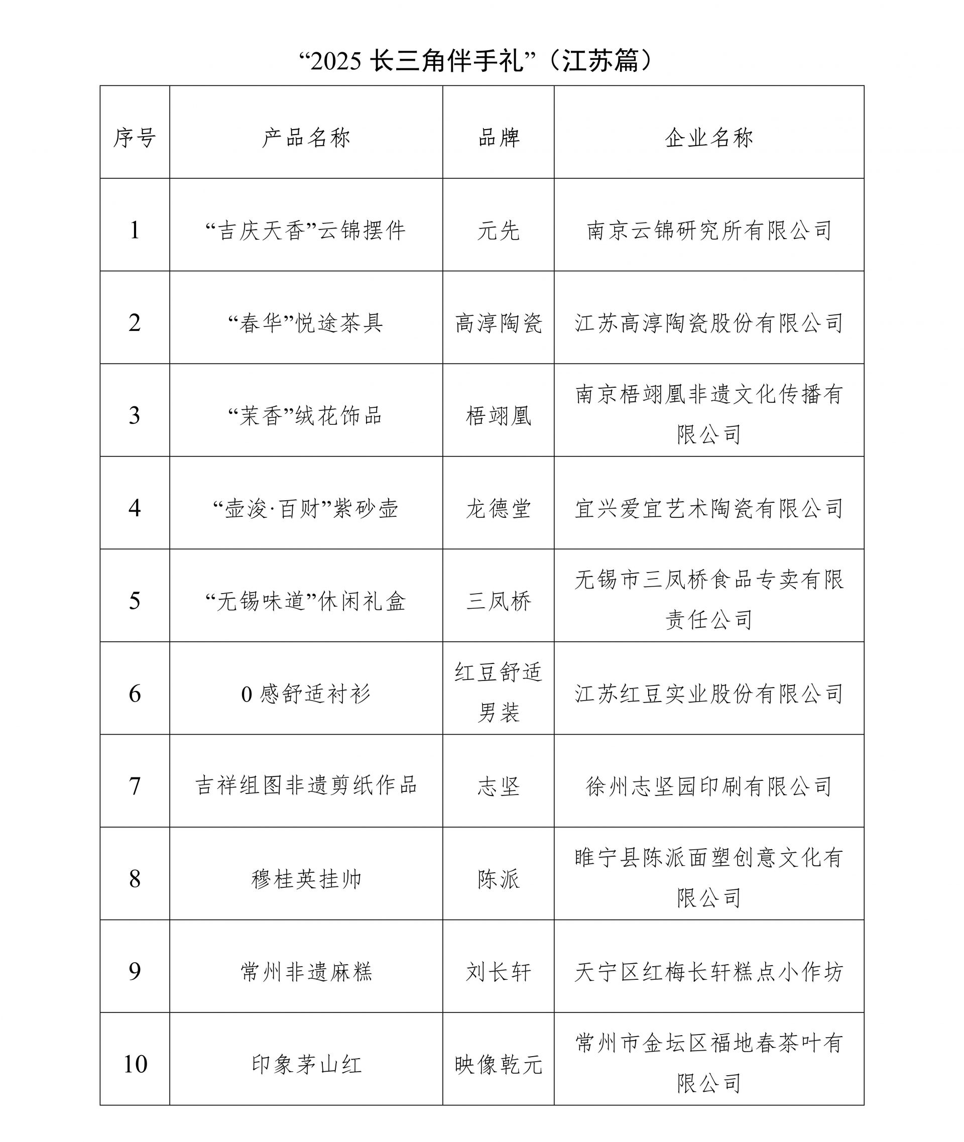 近日,“2025长三角伴手礼”名单正式发布,江苏云先的“吉庆天香”云锦摆件、梧翊凰的“茉香”绒花饰品、三凤桥的“无锡味道”休闲礼盒、陈派面塑穆桂英挂帅、刘长轩的常州非遗麻糕、曹裕兴的“七色龙宝”蓝印布偶、“茶之晶品”系列水晶茶具、天晶盐雕的吉祥三宝盐雕、谢馥春馥彩名媛香膏套盒、中剪的扬州剪纸百蝶百花百菊镜框、镇博的论语玉烛系列文创、乾隆贡酥等30款产品入选。