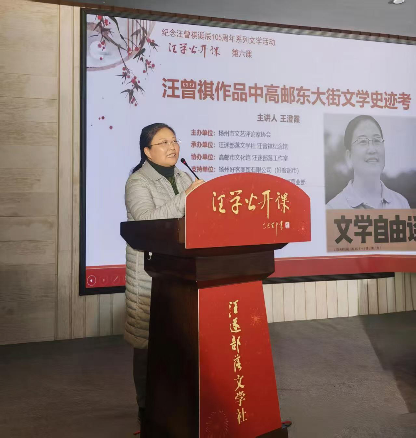 高邮东大街,是汪曾祺童年和青年时代的住处。这里的社会境况和文化氛围,孕育了汪曾祺的精神气质,也是他后期以高邮乡土文化为题材的文学创作的重要来源。因此,深入了解东大街的历史变迁,寻找汪曾祺作品中涉及的文学史迹,可以帮助我们更好地理解汪曾祺作品的精神内涵和文学趣味。12月14日下午,由扬州市文艺评论家协会主办的第六课“汪学公开课”,邀请到扬州大学文学院教授王澄霞,解读高邮东大街的文学史迹。