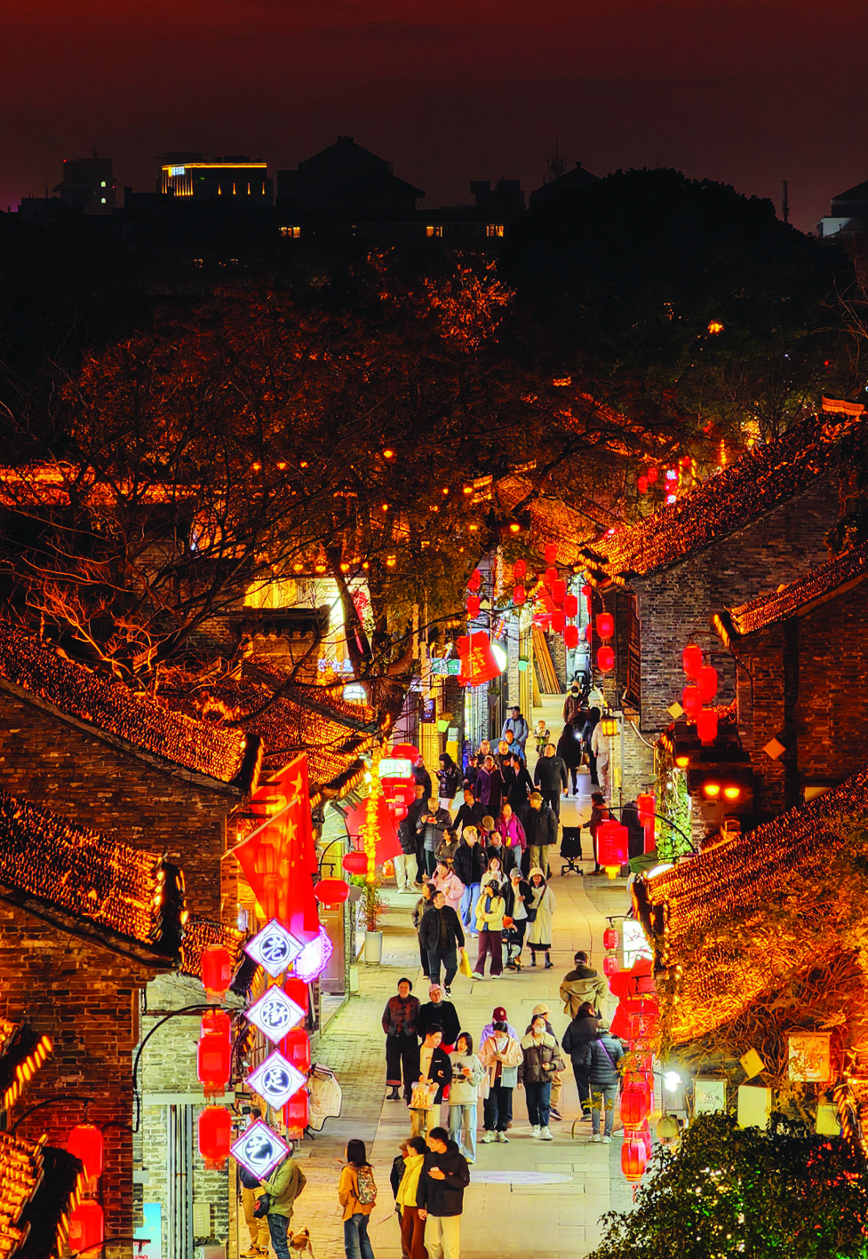 12月15日出版的《人民日报(海外版)》刊发了由扬州市新闻传媒中心记者拍摄的照片。近年来,扬州通过实施多项便民措施,创新夜游产品,鼓励夜间餐饮、旅游、文化等消费活动,培育消费新热点,持续释放“夜经济”活力。图为夜幕降临,东关街灯火璀璨,游客漫步古街。 孟德龙 摄