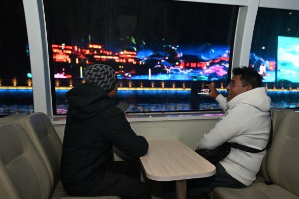 如果说白天的扬州是古典的水墨画,那么夜晚的古城就是流动的光影诗。14日晚,踩线团登上游船体验“大运扬州”古运河行进式游船演艺,在近一个小时的航程中,“吴王开运”“隋唐起运”等五大篇章通过光影与演艺交织,将古运河的千年历史娓娓道来。