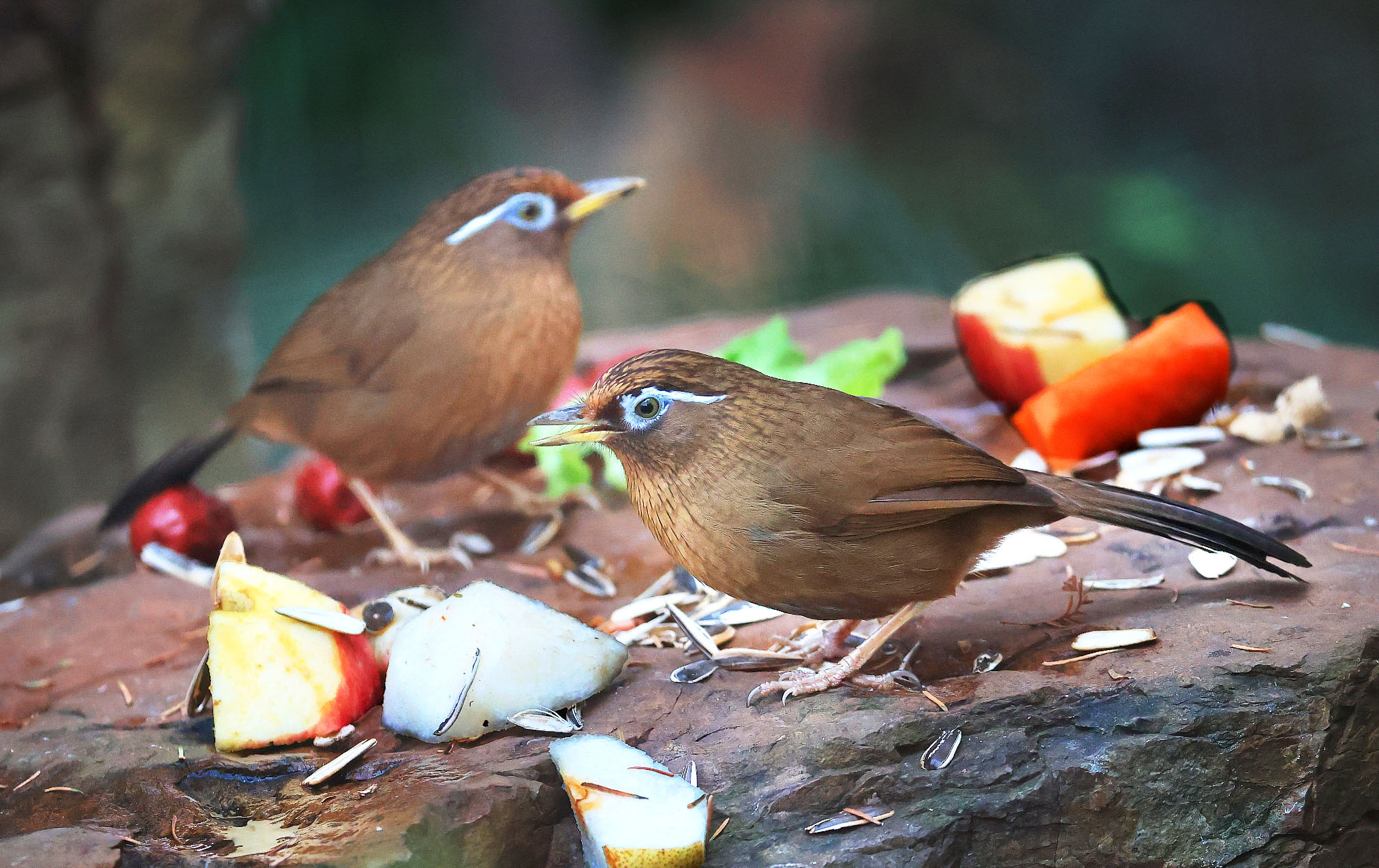 在专门饲养猴类的“灵谷”,一对画眉“蹭吃”猴食的有趣场景在上演。画眉由于鸣叫动听,曾在花鸟市场备受欢迎,升级为国家二级保护动物后,已被禁止买卖。 蒋永庆 摄