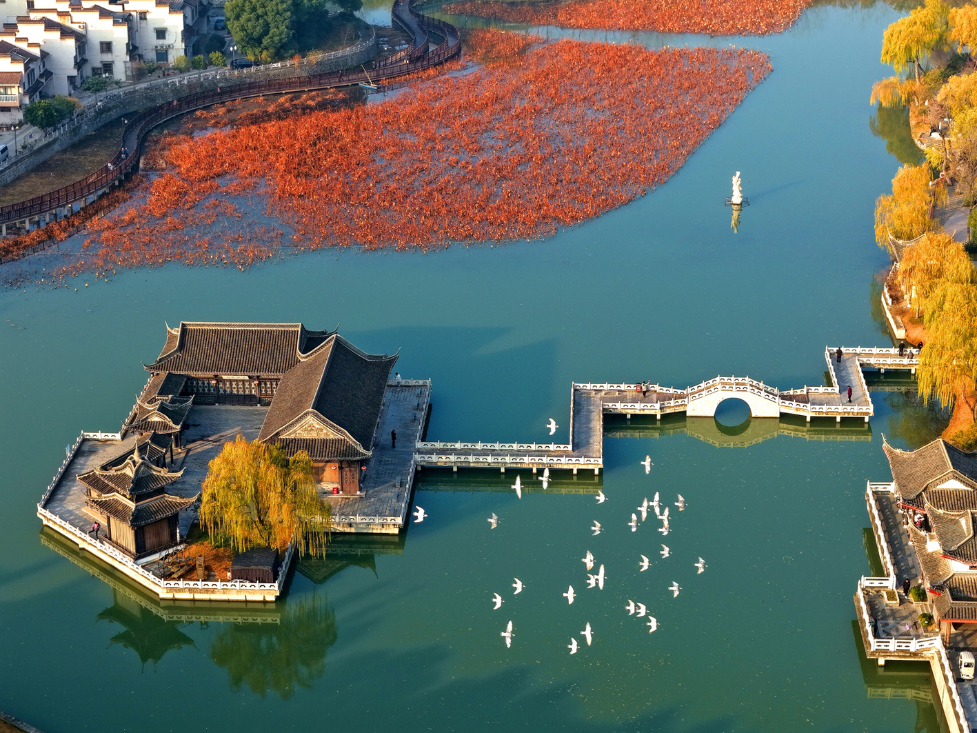 寒冬时节,荷花池公园群鸟飞翔,残塘恍若秘境,满目金黄与碧水相映成趣,尽显别样风韵。严柏平 程曦 摄