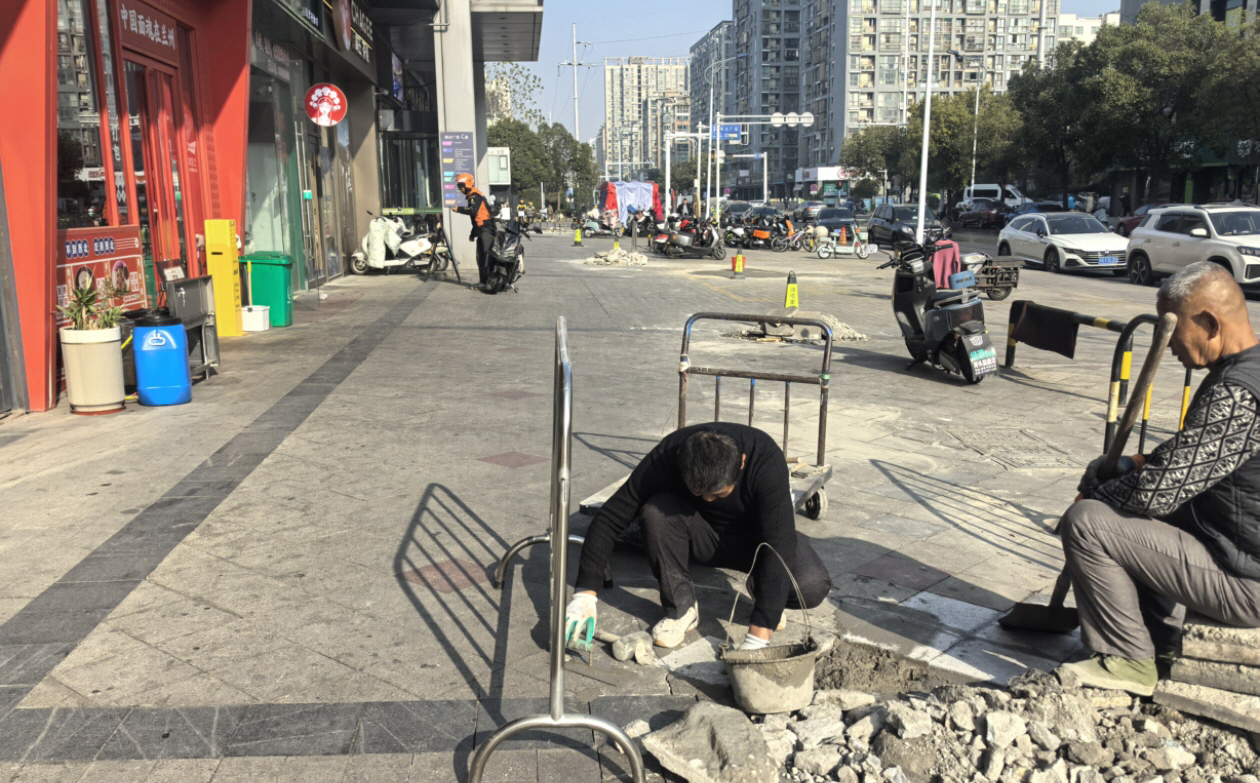 18日,记者在顺达广场楼下看到,多处破损地砖已经铲除,有工人在现场开始统一修复。