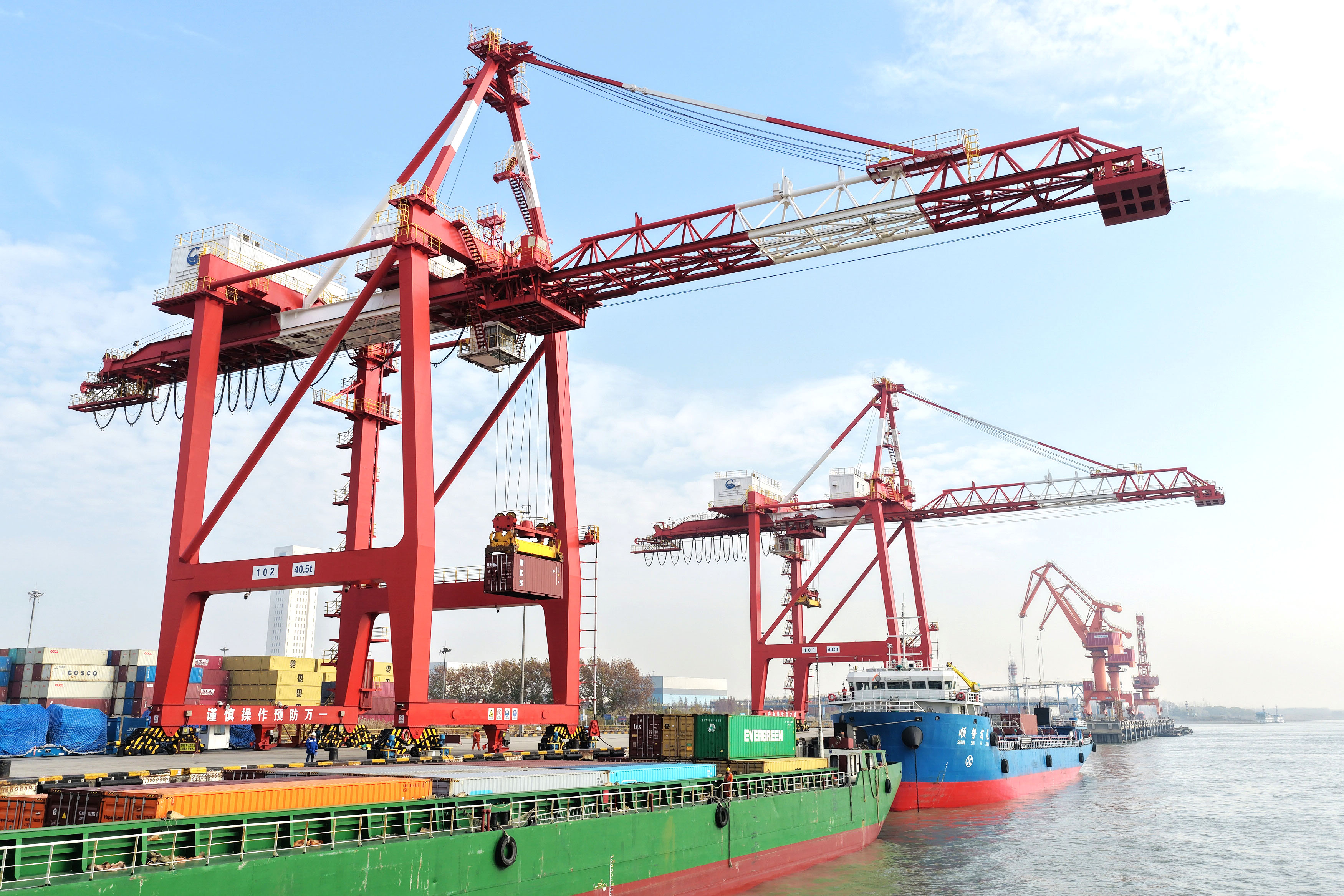 临近年末,扬州港码头有序高效运行,卡车在集装箱堆场往来穿梭,岸桥高效运转装卸,码头上一派繁忙景象。