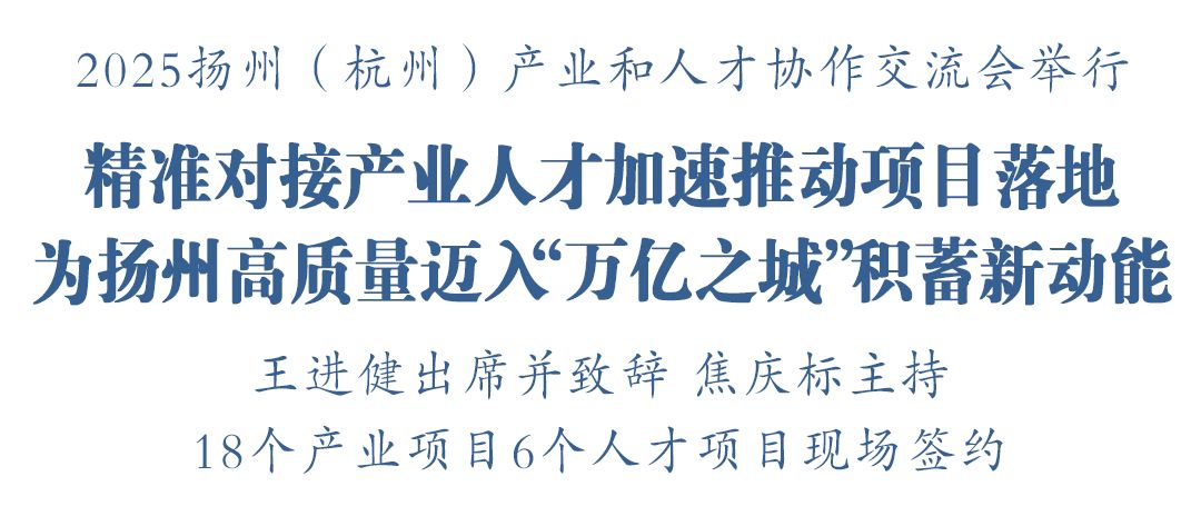 王进健在致辞中说,扬州是习近平总书记称赞的“好地方”。近年来,扬州紧扣高质量发展这个首要任务,锚定产业科创、文化旅游、生态宜居“三个名城”建设不动摇,聚焦“6群13链”现代产业体系,紧盯重大项目、科技创新、园区转型抓攻坚,“十四五”即将圆满收官。“十五五”新征程即将开启,扬州将接续奋斗,不断扩大经济总量、提升城市能级,致力打造产业发达、创新驱动、人才汇聚、中心枢纽、环境友好的“万亿之城”,打好科技招商、高企引育、专精特新培育“组合拳”,为人才提供体系更全面、措施更务实、福利更丰厚的支持,为项目建设提供全链条、全时域、全生命周期服务。