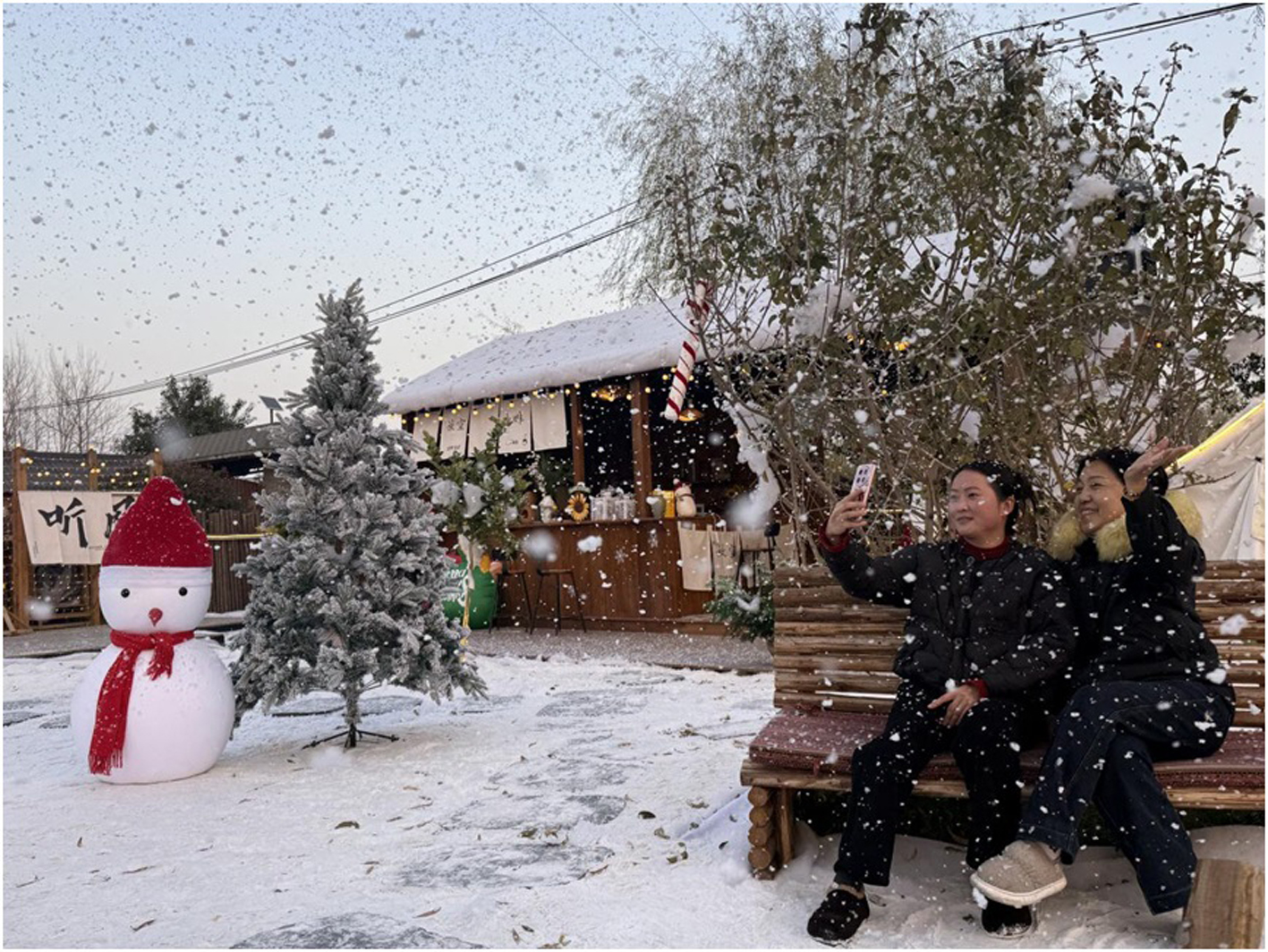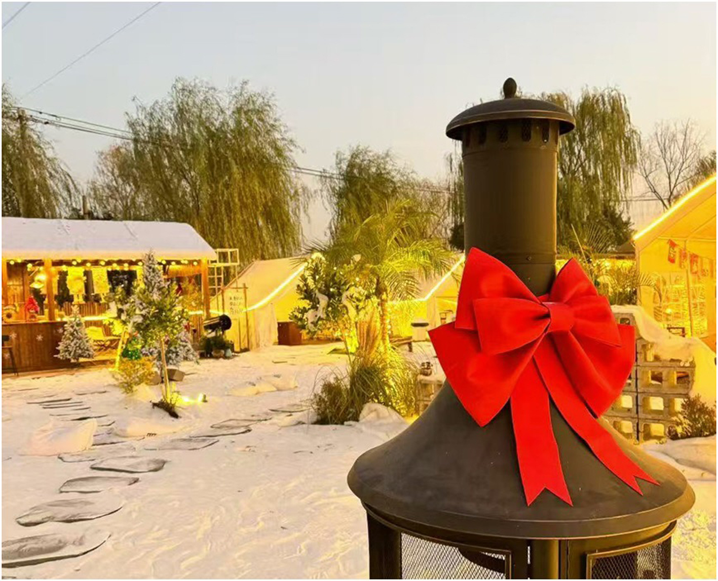 童话小木屋上“积雪”层层堆砌,“雪花”漫天飞扬,篝火中的木柴噼啪作响,让人仿佛置身于雪乡秘境……这个冬天,扬州市瓜洲村葵园把浪漫的“不冻雪”搬进了葵园烤乐营项目内,不用远行,在这里就能沉浸式解锁乡村雪景的唯美氛围感。