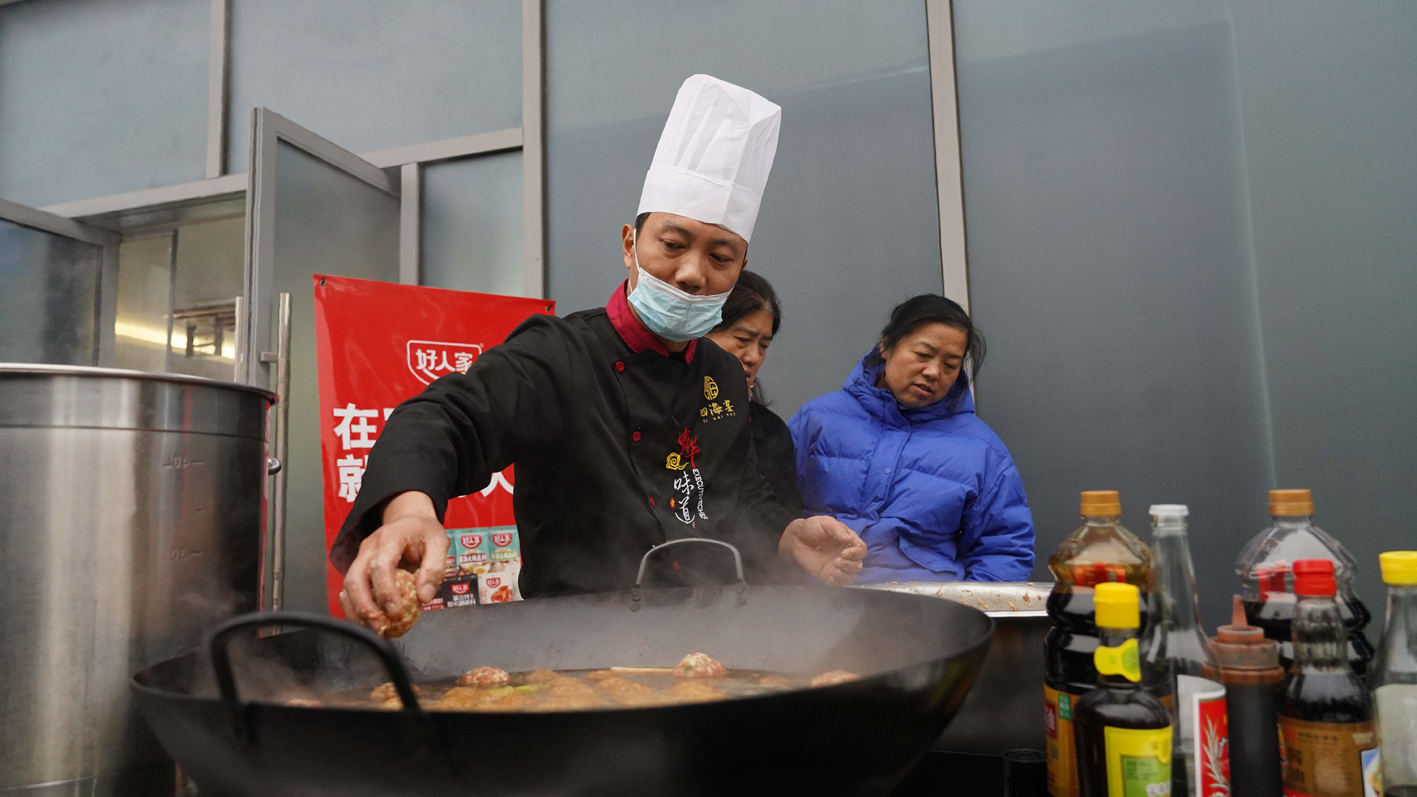 除了榆林炖羊肉,大厨团队还精心烹制了红烧狮子头、糖醋排骨两道经典家常菜品。“排骨先焯水去血沫,炒糖色时要小火慢炒至琥珀色,再加入葱姜,倒入开水没过排骨慢炖,这次我们再搭配天味食品提供的好人家调味料,制作出的糖醋排骨酸甜适中、老少皆宜。”四海宴大厨冯玉柱一边操作一边细致讲解烹饪步骤,将食材处理、火候把控等关键技巧毫无保留地传授给现场市民。