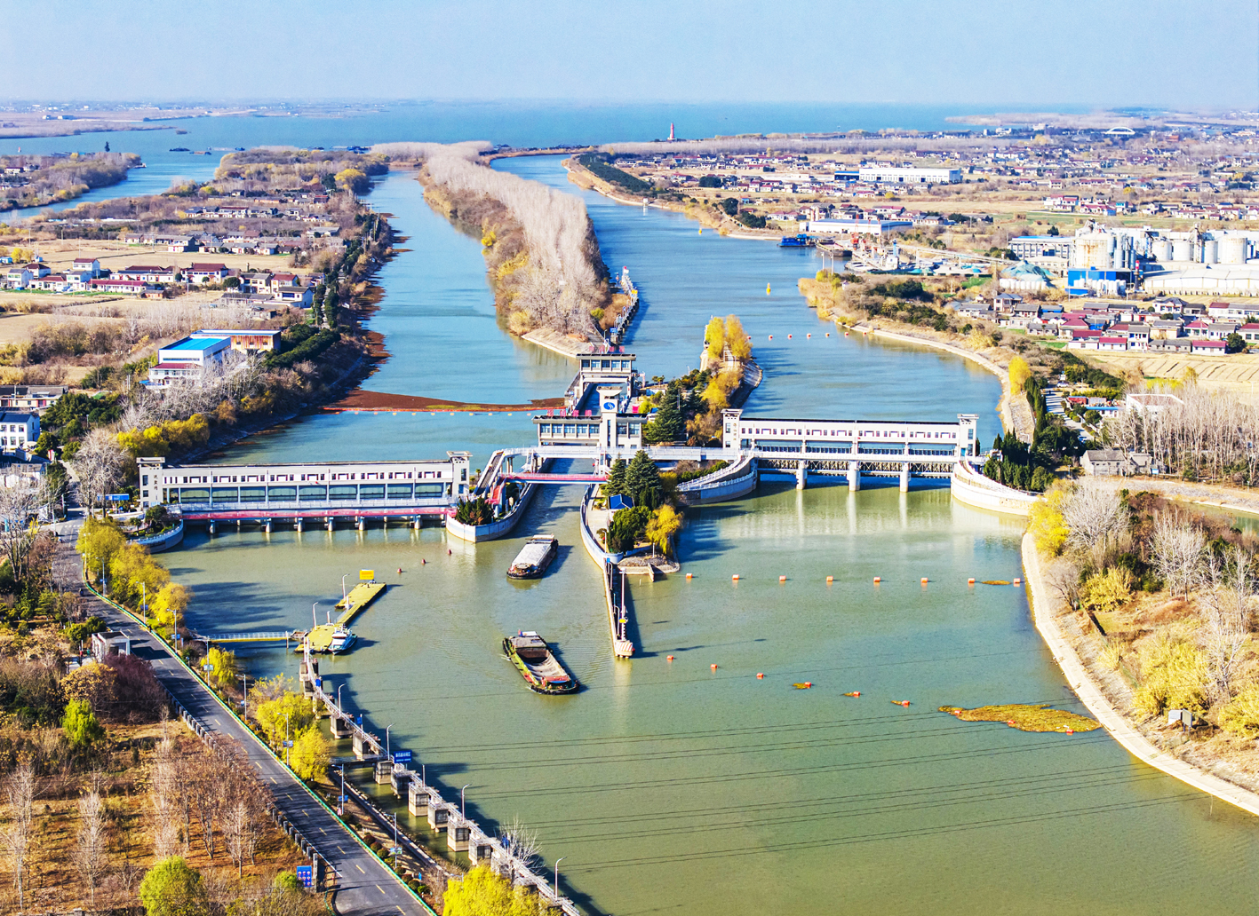 南水北调东线一期工程2025至2026年度冰期输水21日启动,预计2026年2月结束。图为在江都区拍摄的南水北调东线一期工程运盐闸、邵仙套闸、邵仙闸洞。 新华社发(任飞 摄)