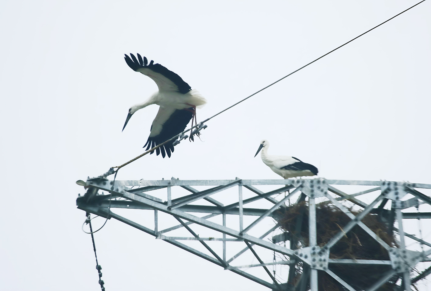 在相距大昌村10多公里的郭庄附近,杭德泉和王涛发现一座输电铁塔顶上,有1只东方白鹳正在搭新巢,它不停地用喙衔起树枝重新安放,十分专注用心地经营它的爱巢;而另一只却在塔下的地上寻觅食物,现场的氛围温馨安详。