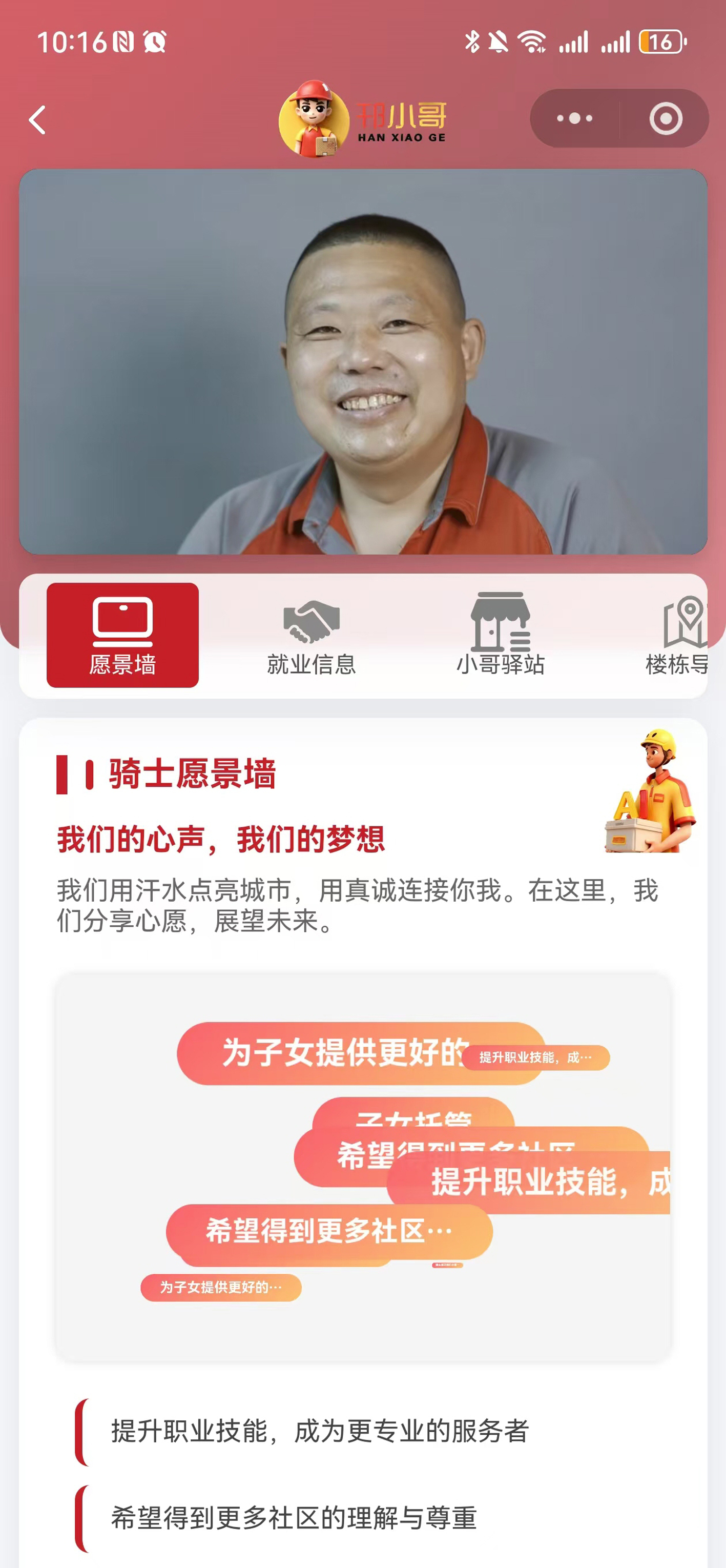 更值得关注的是系统的互动功能。“愿景墙”支持小哥实时上传诉求,形成“提出—响应—反馈”的闭环机制;“任务接单”模块则让小哥可以利用走街串巷的职业优势参与社区治理,完成任务可获得相应奖励,实现了从“服务对象”到“治理伙伴”的角色转变。