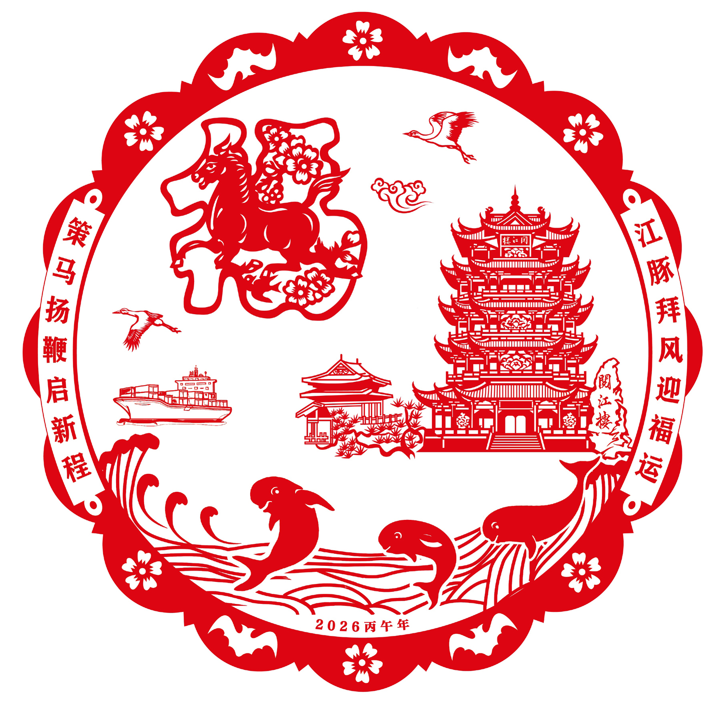 新的马年江豚主题生肖窗花,以“江南四大名楼”之一的“阅江楼”为背景,福字内嵌入中国旅游标志“马踏飞燕”。福字两侧,两只“东方白鹳”正在自由翱翔,水面浪花中三头江豚正以不同姿态跃起,远处一艘巨轮正扬帆远航……两旁“江豚拜风迎福运 策马扬鞭启新程”的对联,预示着人与自然的和谐共生及新一年的美好前景。