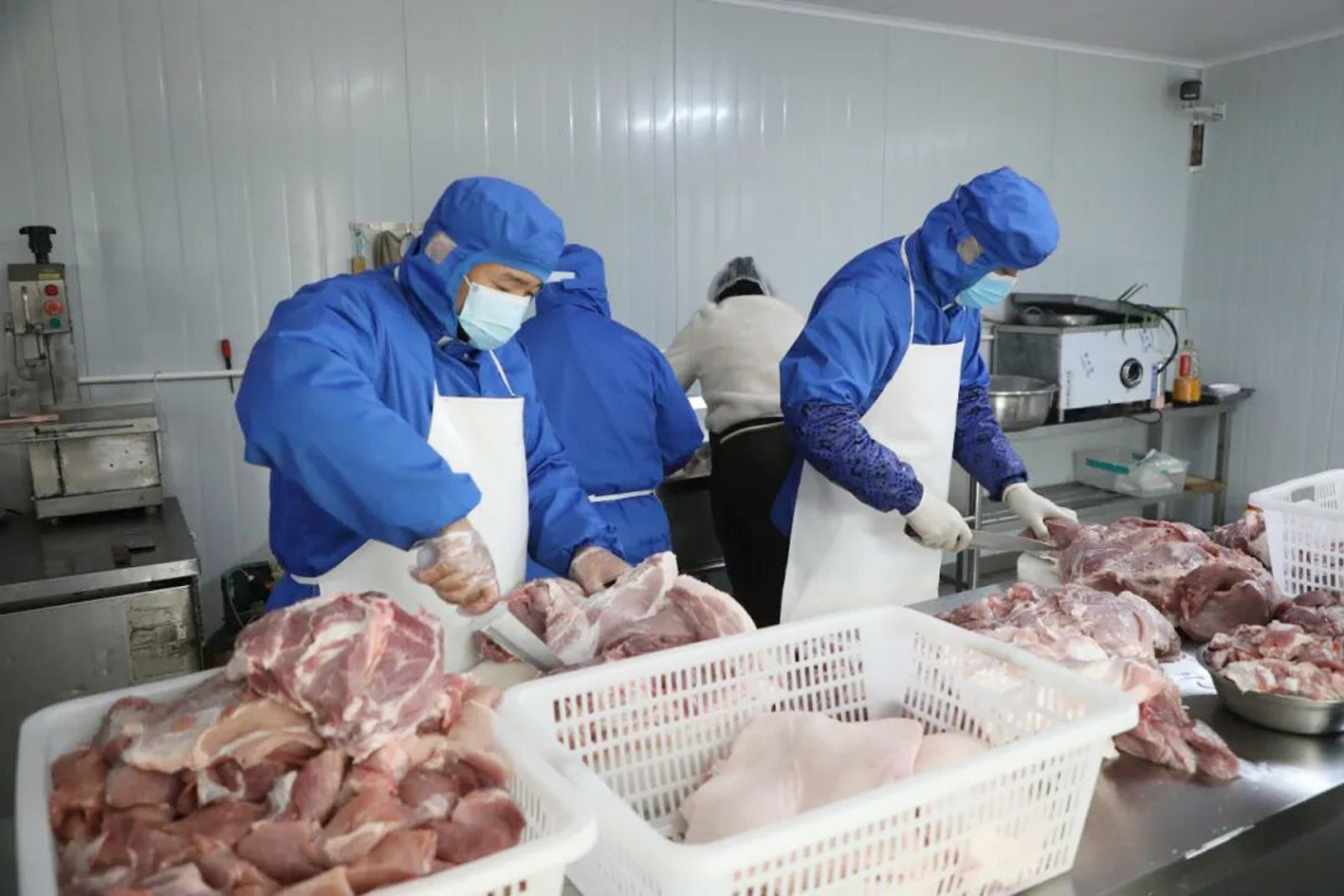 12月20日,记者走进王兰英夫妇香肠加工坊。备好的猪肉经过清洗后,经工人师傅之手切成大小均匀的小块,再放入搅拌机搅碎成肉丝,每道工序都一丝不苟。为了保证品质,灌制香肠前,王兰英都会亲自挑选优质鲜猪肉,这是灌出美味香肠的基础。她说:“现在人们普遍不爱吃肥肉,因此我们将前腿肉和后腿肉搭配使用,肥瘦比例控制在二比八,即两成肥肉、八成瘦肉。所有原料均经过称重,实现标准化生产,确保香肠口感始终如一。”