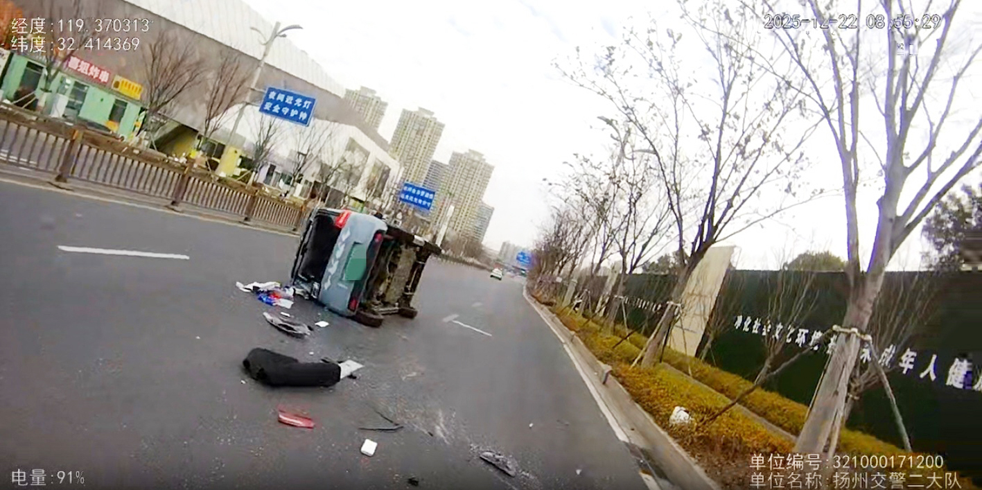 上午8:15分左右,俞某驾驶新能源小型轿车沿平山堂西路由北向南行驶至润蜀路与平山堂交叉口,在由北向东左转弯过程中。由于车速过快,车辆瞬间打滑,在三个车道内摇摆不定,从最左侧车道漂移至中间车道,俞某仍不能刹停,后车辆侧翻。撞上路旁绿化隔离带,车辆又开始反弹,最终倒在了中间车道。幸运的是,当时三个车道内均没有其他车辆,否则后果不堪设想。