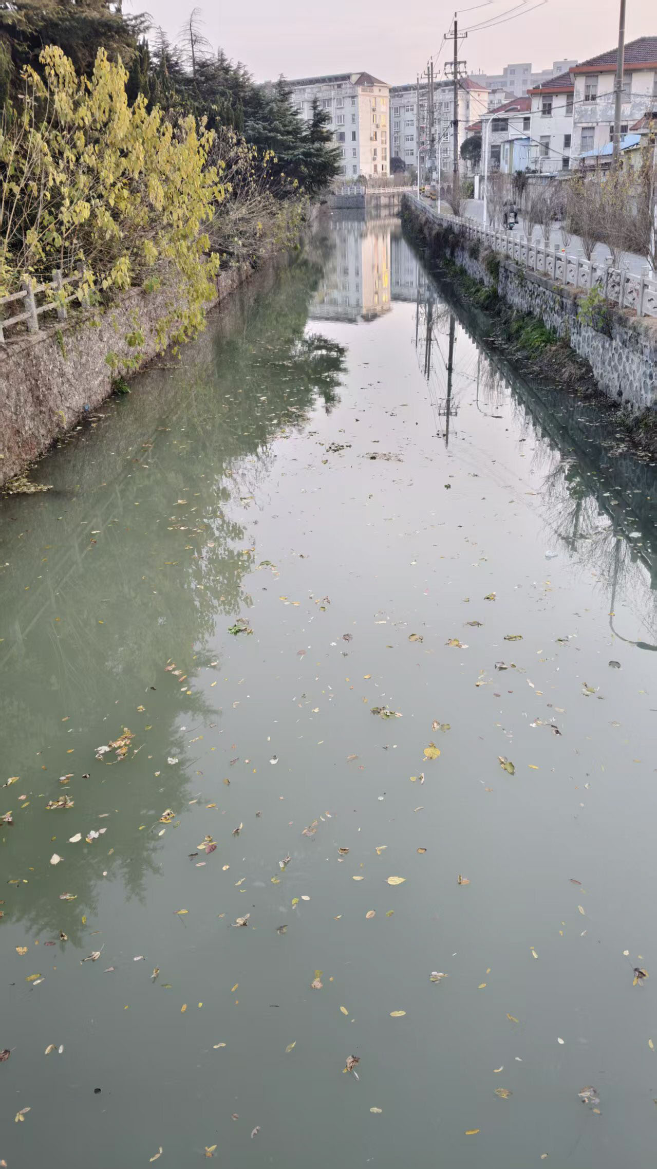 最近,记者来到城东公寓楼附近的沙施河探访。站在二里桥上往下俯视,记者看到,河面上漂浮着落叶及零散的杂物,水质看着不太清澈。