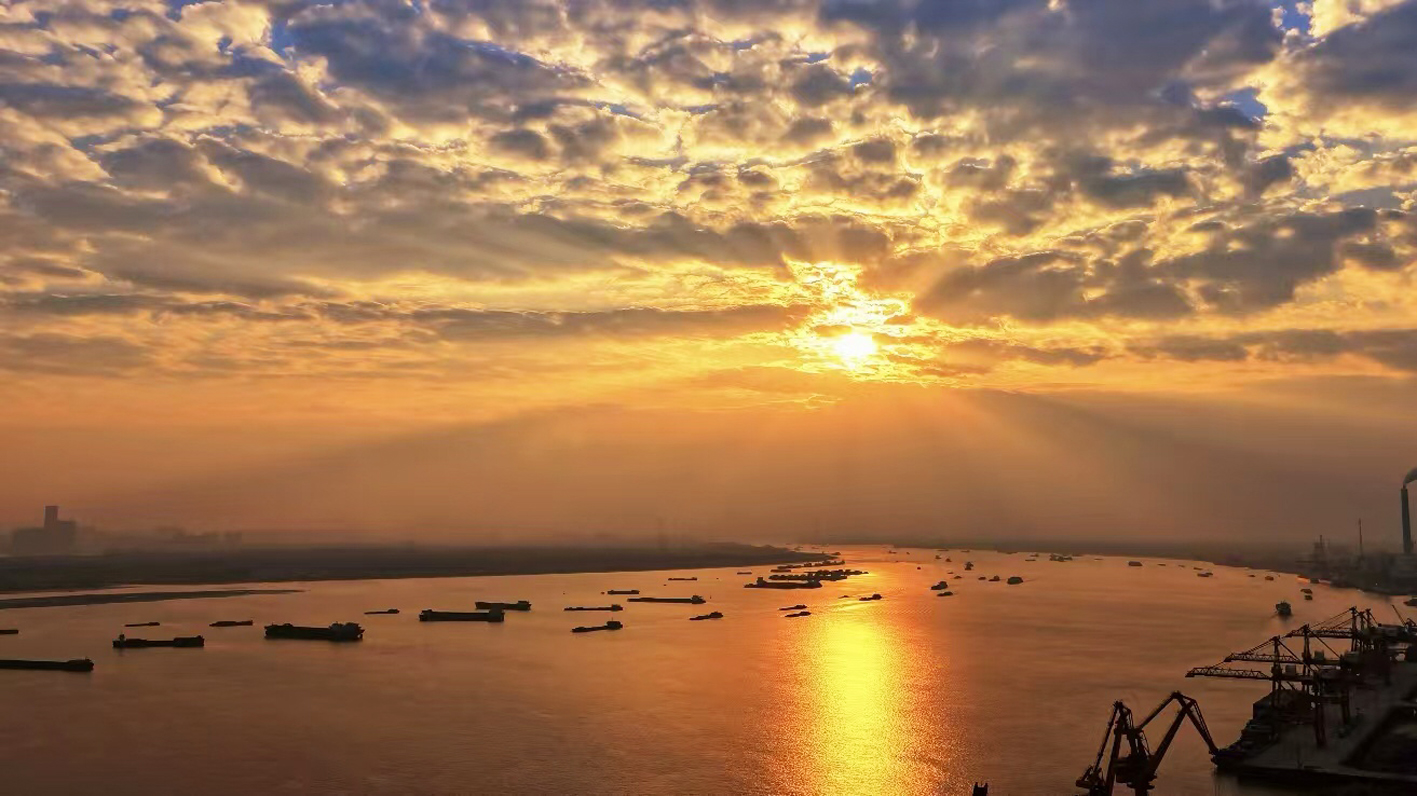 近日,长江扬州段上空上演了一场罕见的自然奇观,天空云层分布恰到好处,一道道金色光柱从云层缝隙中倾泻而下,与江面波光粼粼的倒影交相辉映,浑然一色,构成一幅壮美的自然画卷。