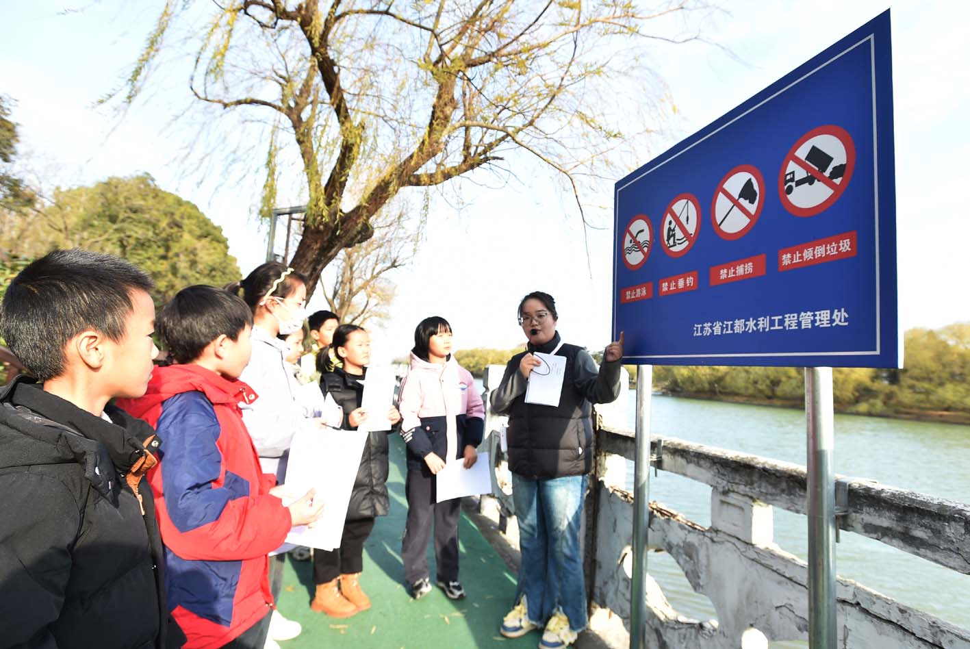 近日,由江都区小学生代表组建的“小河长”水环境志愿巡查小分队变得格外忙碌。12月21日,随着南水北调东线工程2025年至2026年度冰期输水正式启动,“小河长”们在环保志愿者带领下,利用双休日走进江都水利枢纽周边水域河堤,开展公益巡查河道实践活动。图为“小河长”正在河道现场学习水生态保护知识。庄文斌 摄