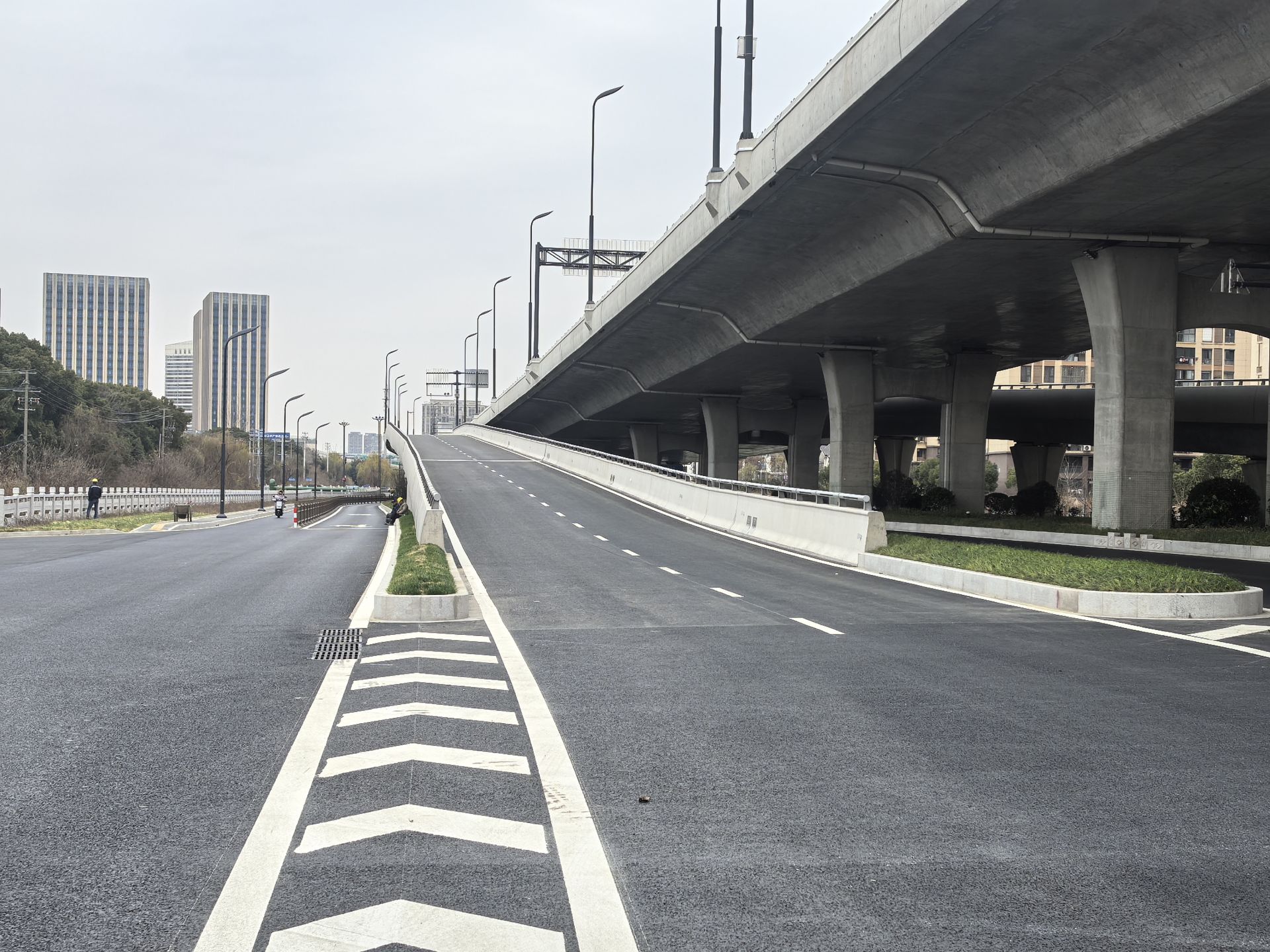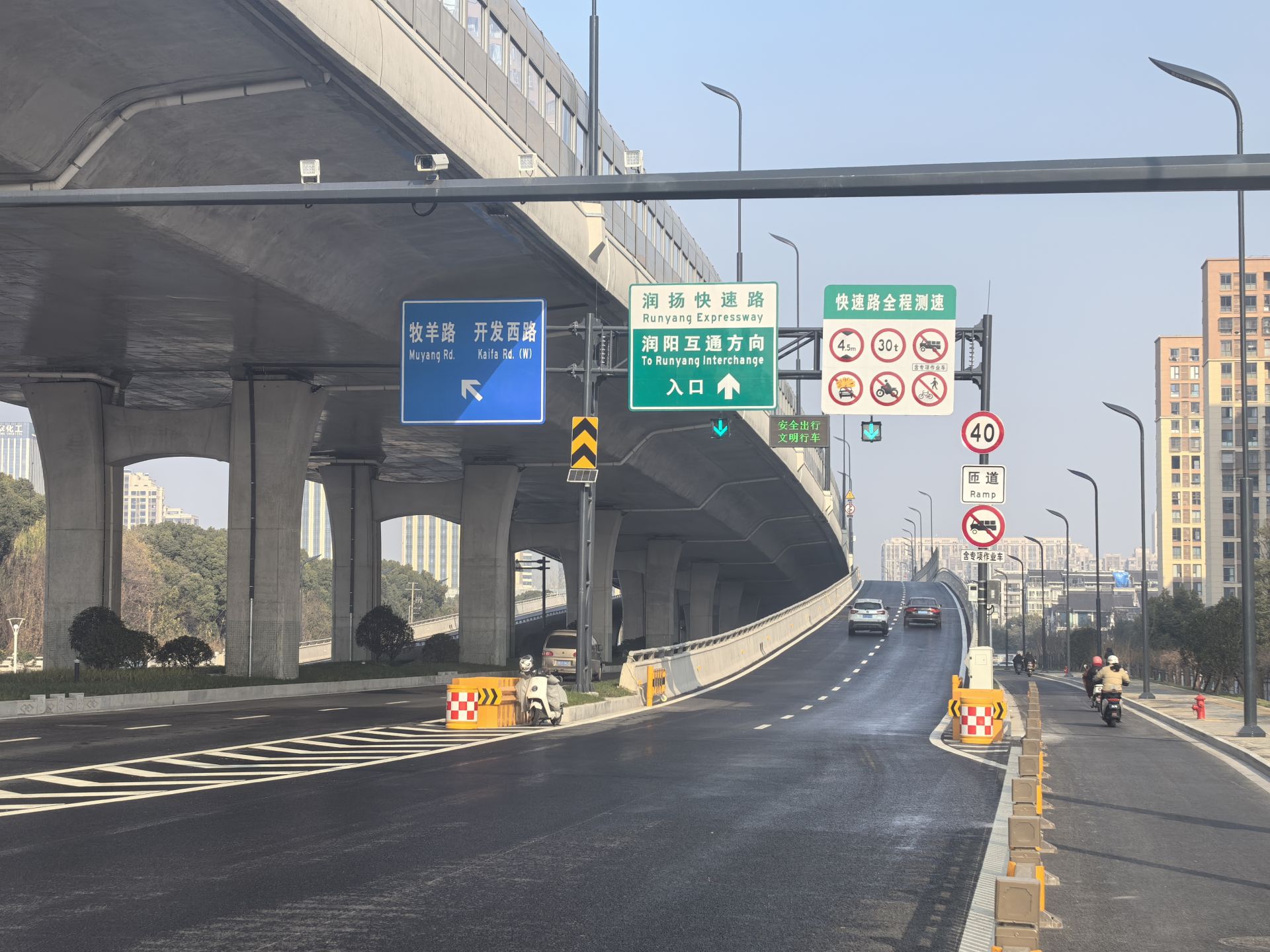 记者在润扬快速路南延工程现场看到,新建成的高架桥气势恢宏,犹如一条长龙穿梭在住宅小区和学校、工厂之间。路面平坦宽阔,两侧隔音屏、路灯和上方的指示牌等各项附属设施完善。地面道路较改造前实现拓宽,路况显著优化,沿线增设了海绵城市措施,目前已基本开放交通,车辆、行人可正常通行。