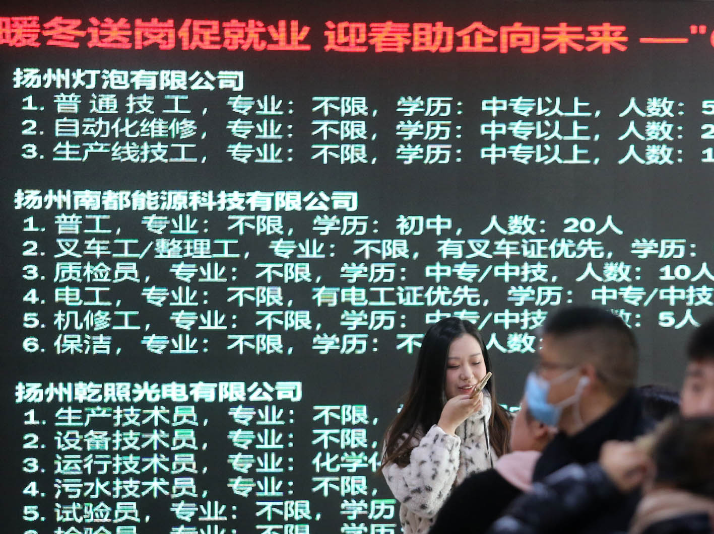12月27日上午,由江苏省劳动就业管理中心、扬州市人力资源和社会保障局联合主办,扬州市劳动就业服务中心、扬州市人力资源市场管理办公室承办的“暖冬送岗促就业 迎春助企向未来”扬州系列招聘活动暨脱贫人口就业帮扶省市联合招聘——扬州“613”产业集群暨制造业专场招聘会在月城科技广场举行,一场“线上+线下”的招聘活动,为制造企业与人才之间搭建了平台,让供需对接更直接、更有效。
