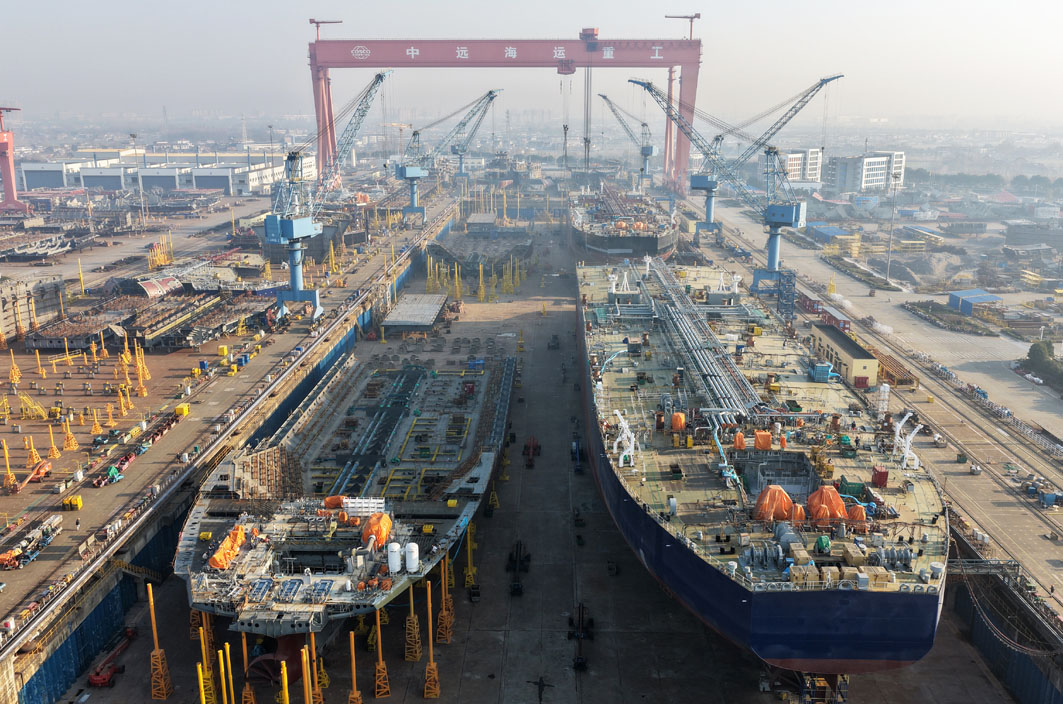 临近年末,扬州中远海运重工有限公司厂区一片繁忙景象,工人们抓紧建造各类大型船舶,力保完成全年生产任务,全力冲刺“全年红” 。