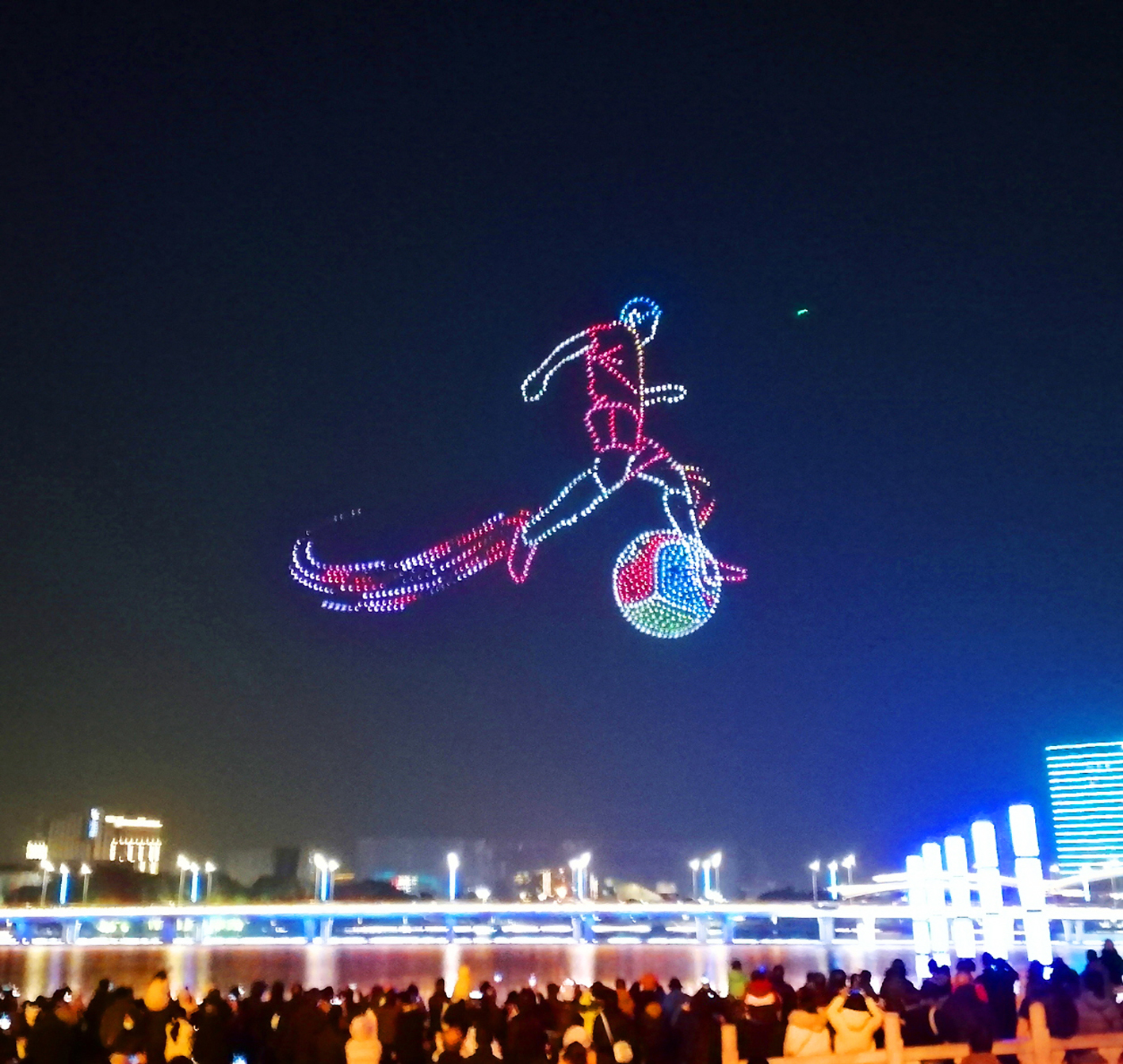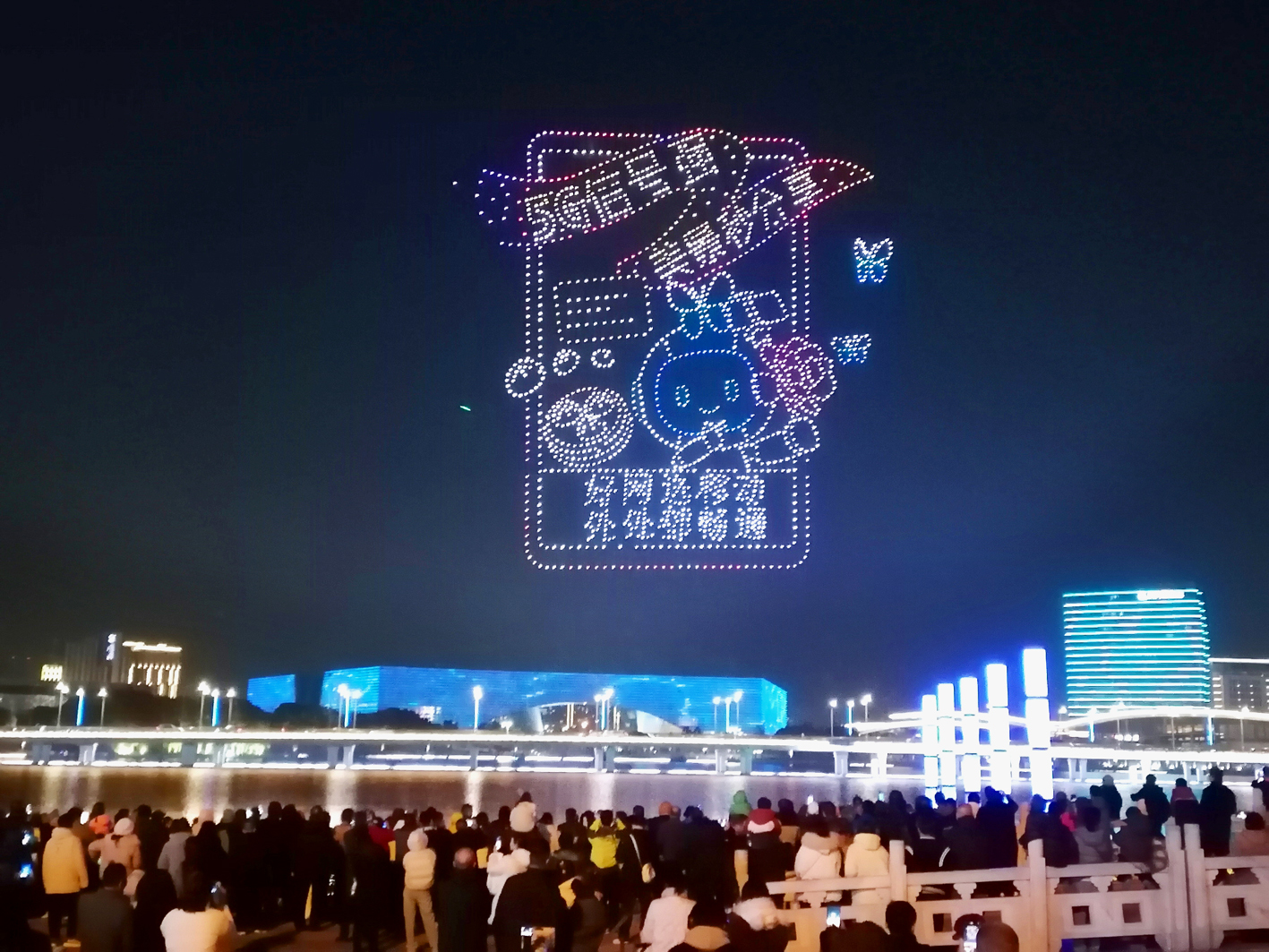 昨晚,明月湖畔无人机飞行表演点亮夜空。孟德龙 程曦 徐逸雨 摄