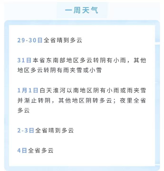 具体天气预报如下:29-30日,全省晴到多云;31日,本省东南部地区多云转阴有小雨,其他地区多云转阴有雨夹雪或小雪;1月1日,白天淮河以南地区阴有小雨或雨夹雪并渐止转阴,其他地区阴转多云,夜里全省多云;2-3日,全省晴到多云;4日,全省多云。12月30日夜里-1月1日,全省迎来较强冷空气,大部分地区48小时最低气温降幅可达5~7℃;1月2-3日,沿淮和淮北地区最低气温-5~-6℃,本省东南部地区-1~-3℃,其他地区-3~-5℃,全省大部分地区出现冰冻。12月31日-1月1日,陆上阵风可达5~7级;12月31日-1月2日,沿海海面阵风可达6~8级。