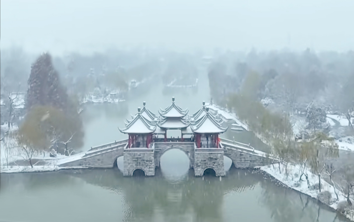 昨天是元旦,扬州迎来2026年的第一场雪。雪后的瘦西湖景区银装素裹,分外妖娆。
