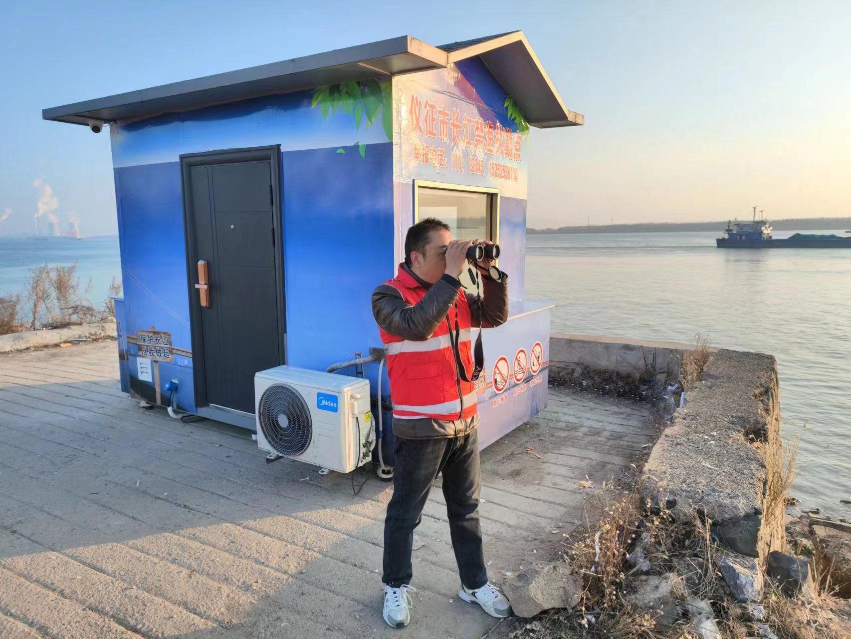 杨怀忠举起望远镜,开始扫视整个江面及岸边。每每看到人或物品,他都会停留几秒,判断是不是钓鱼的、捕捞的,有没有可能是渔具。“钓鱼的要进行劝离,如果发现非法捕捞网具或者线索要第一时间记录并向执法人员汇报处置。”他解释道。