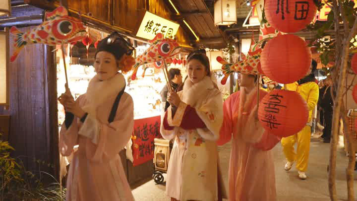在东关街,身穿传统服饰的巡游队敲锣打鼓,持传统鱼形彩灯“踩街”,吸引无数眼球,市民游客纷纷拍照留影。现场同步推出古风表演、非遗互动、美食市集等活动,让游客在领略古城风韵的同时,“一站”尽享节日欢愉氛围。市集负责人称:“从入口的地方上去,围绕着整个市集从上往下俯视,可沉浸式体验宋代古风市集。”