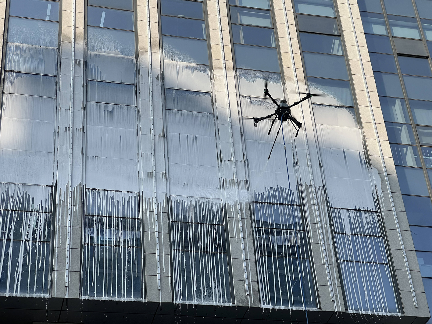 无人机向玻璃幕墙喷洒清洁剂。露莎 摄