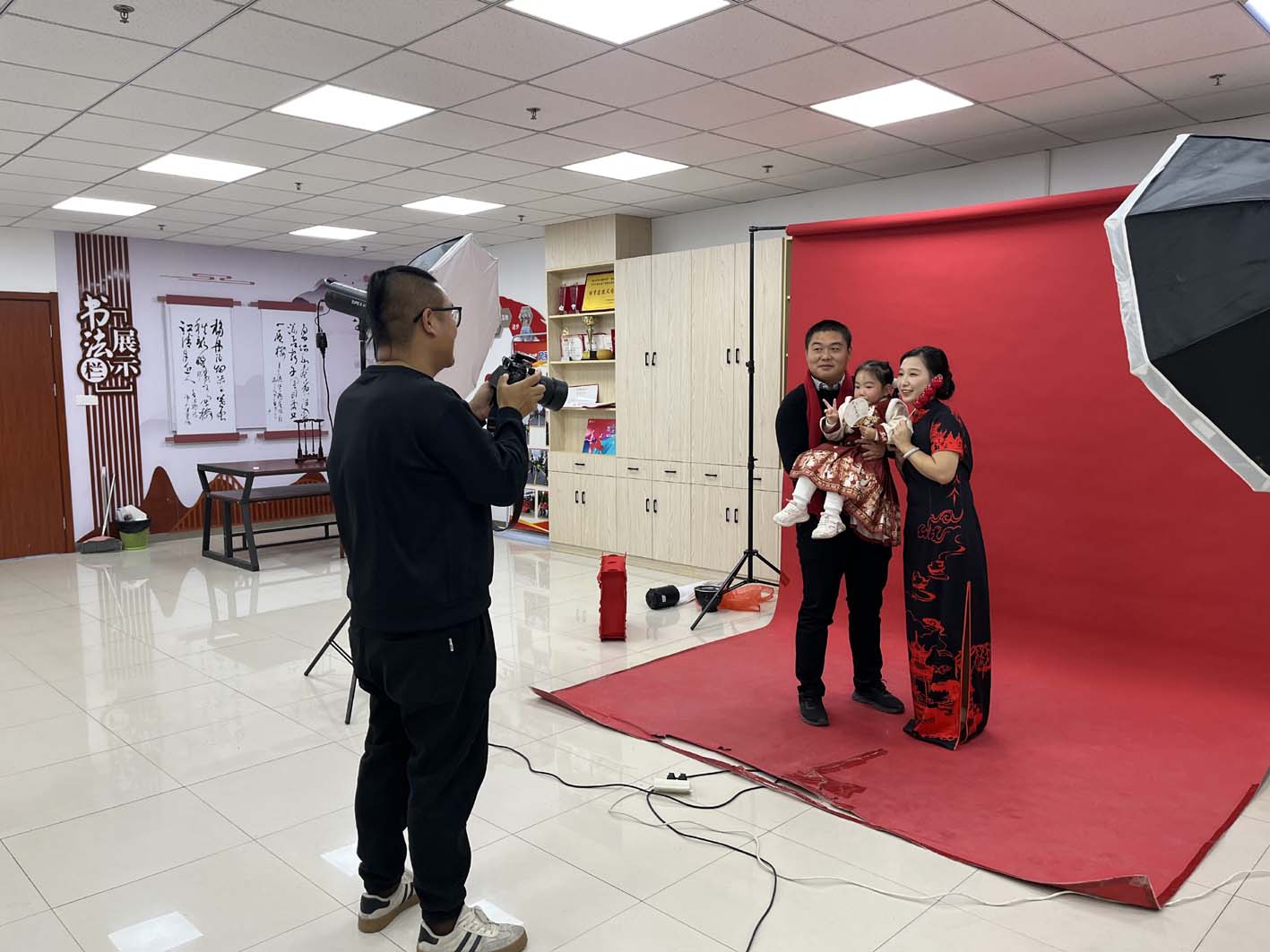 活动在社区党群服务中心举行。社区联合专业摄影团队,不仅精心布置了拍摄背景、灯光设备,还提供多款典雅喜庆的旗袍与专业妆造服务,吸引了众多家庭踊跃参与。