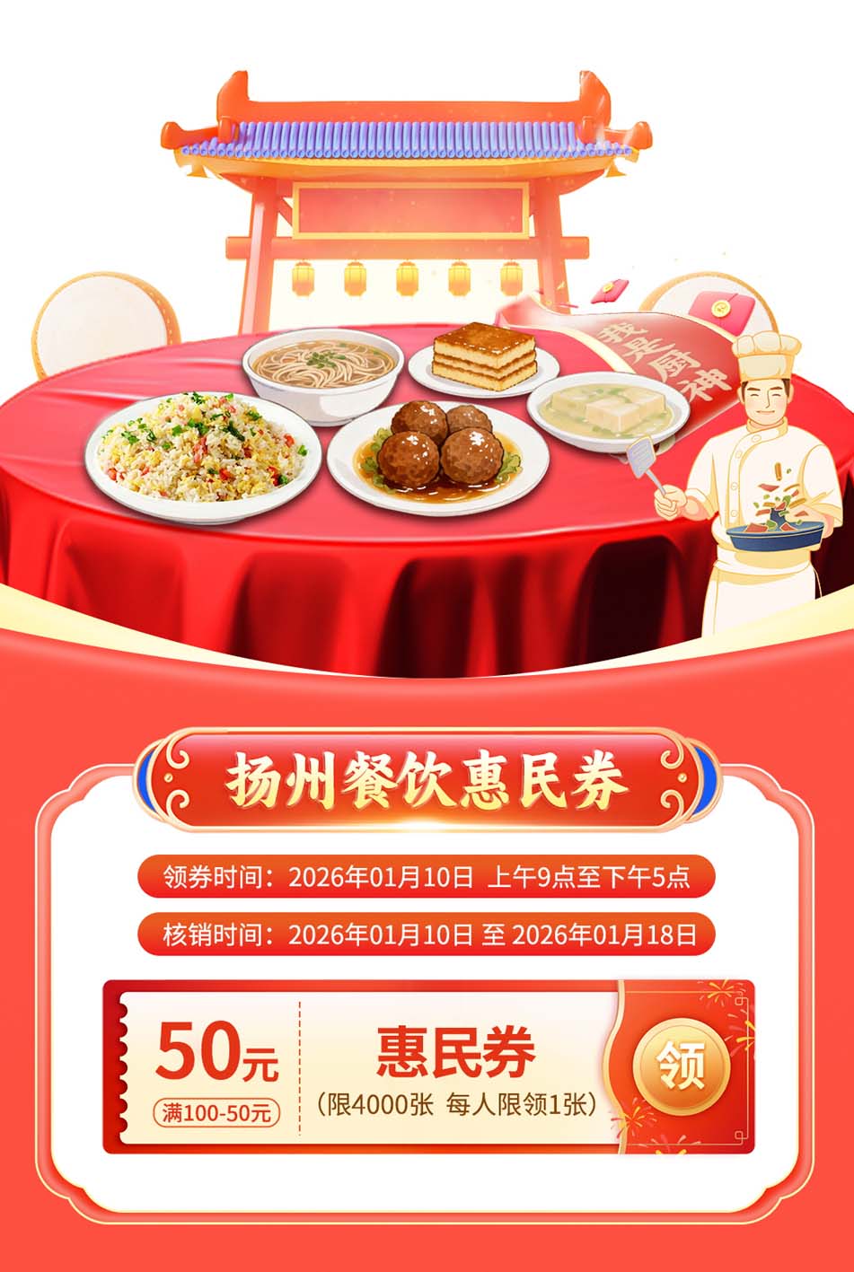 市商务局相关负责人介绍,扬州将在现场推出总额达20万元的餐饮惠民券。此次发放的惠民券为满100元减50元券,限量4000张,每人限领1张。领券时间为2026年1月10日9:00至17:00,核销时间截至1月18日。市民可通过建行生活APP完成注册绑卡后,在活动页面领取,凭券前往扬州参与活动的餐饮企业核销使用。