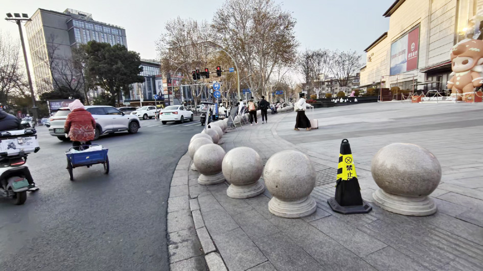 记者注意到,石球放置的位置没有非机动车乱停,现场管理井然有序。记者与多位市民和路人进行了简单交流,提到石球,市民张先生告诉记者,过去这边没有石球放置的时候,有时有非机动车辆扎堆乱停,后来设置了石球,门口及路口区域停车乱象明显得到改善,这种举措还是有利的。不过,张先生也觉得,这边有部分石球距离人行步道较近,甚至压着盲道线,给来往行人带来影响,建议商场管理人员能对部分石球进行适当移动。