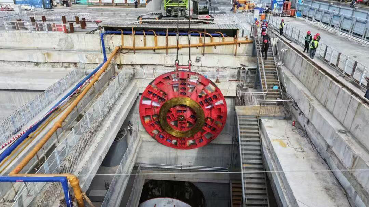 12日上午10时30分,随着指挥人员一声令下,吊装作业正式启动。在大型履带吊机的精准操控下,重达121吨的刀盘平稳起吊,依次完成翻身、旋转等一系列动作,最终精准送入井下始发位置,整个过程安全有序。