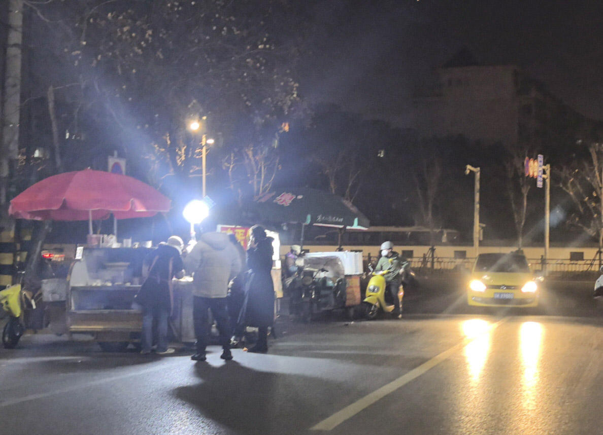 记者来到该路口探访,在尚文路北侧车道边看到有几家做小吃的摊贩。路口过往的车辆较多,小吃摊占用了部分车道,确实影响由北向西过往的车辆通行。
