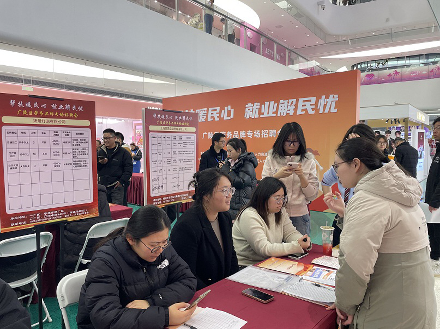 短短半个小时,扬州领煌科技公司现场招聘负责人就收到了10多份简历。现场招聘负责人蒋经理介绍,春节后企业有大量基础岗位的用工需求,商场内人流量大,咨询的人络绎不绝,还有不少父母替正在上大学的孩子前来咨询。“这次招聘既宣传了企业,又招到了员工、意向性实习生等,真是一举多得!”