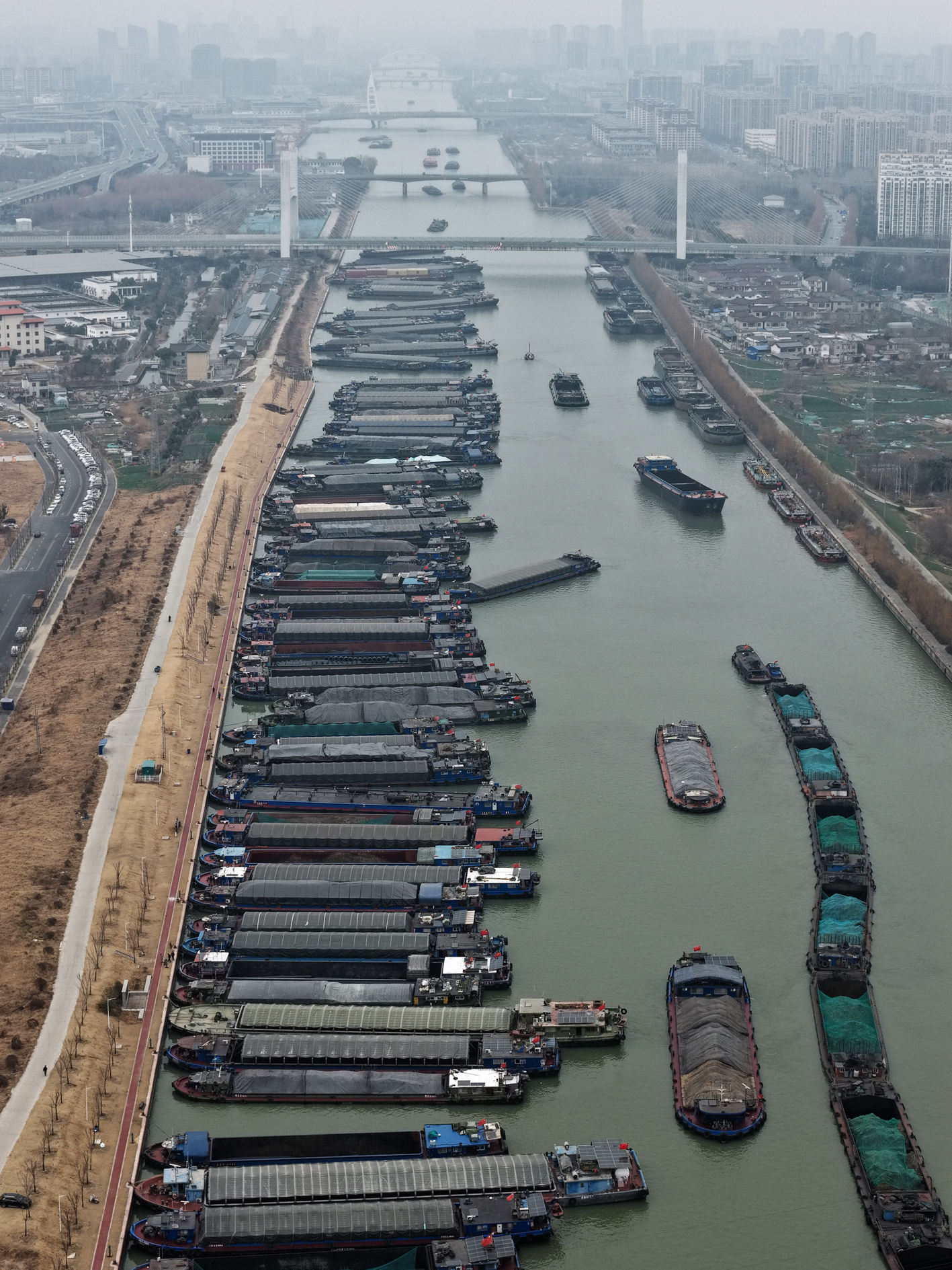 1月18日,受冷空气影响,京杭大运河江苏扬州段大量船舶停靠岸边,躲避寒潮、大风。 孟德龙 摄