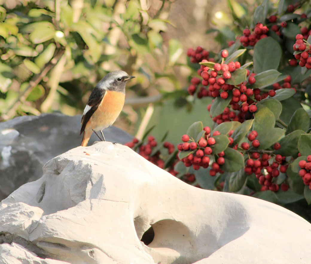 身着灰褐色斑纹羽衣的田鹀,喜欢在地面草丛中跳跃觅食,听到动静便从草丛中飞到树上四处打量。柳莺在树枝上来回穿梭,纤巧的身形在枝叶间划出优美弧线,其标志性的眉纹在冬日暖阳中格外醒目。最受观鸟者追捧的当数有着“熊猫眼”美誉的红头长尾山雀,它们头顶朱红羽冠,眼睑黑色的斑纹酷似熊猫,被鸟友们戏称为“熊猫鸟”,它们喜欢吃冬青红果等植物种子,萌态十足。北红尾鸲胆子最大,即使离人很近也一点不惊慌。