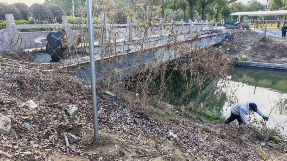 养护人员清理河岸垃圾杂物