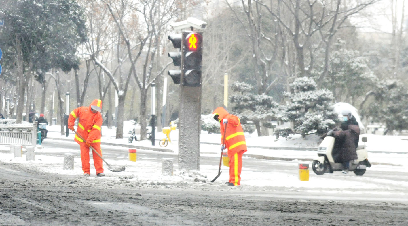 19日20时开始下雪,随着路面积雪越来越厚,市区环卫系统的扫雪车、融雪剂撒布机连夜作业,除雪化冰。凌晨3时起,环卫工人陆续上路,人工铲除非机动车道上的积雪,撒融雪剂融化结冰,将恶劣天气对市民的出行影响降到最小。