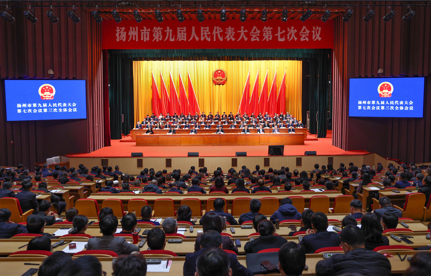扬州网讯 (记者 伊然 洁文 仁辂) 1月23日下午,经过全体代表的共同努力,扬州市第九届人民代表大会第七次会议在圆满完成各项议程后,在市会议中心胜利闭幕。