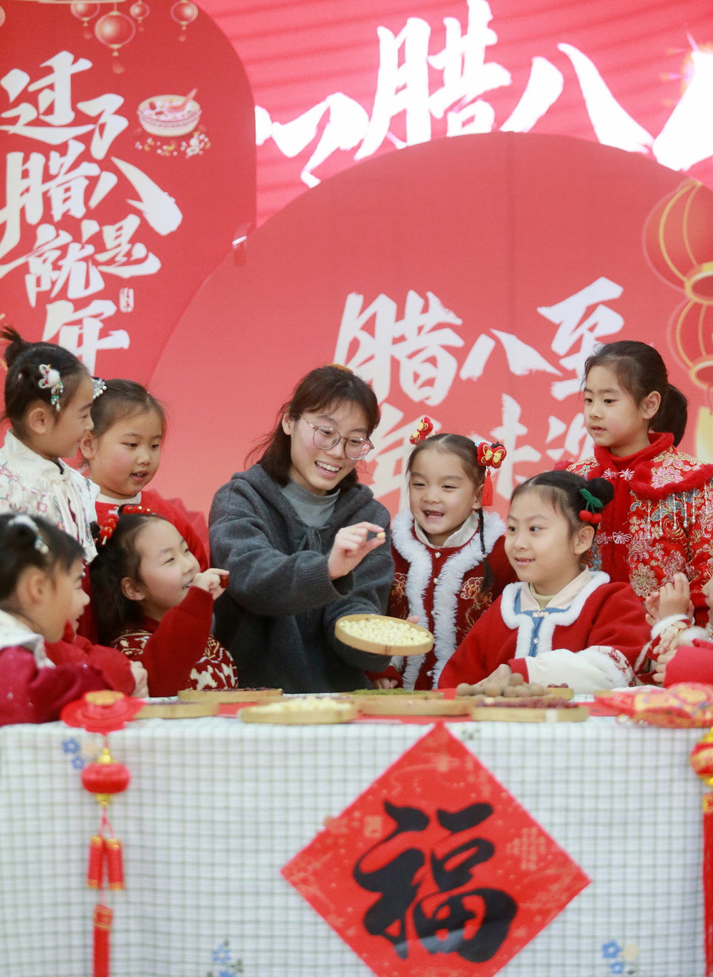 1月24日,新华社播发由扬州市新闻传媒中心记者孟德龙拍摄的题为“多彩活动迎腊八”的新闻图片。腊八节将至,各地开展形式多样的活动迎接腊八节。图为在扬州市九龙幼儿园,老师在教小朋友认识制作腊八粥的食材。