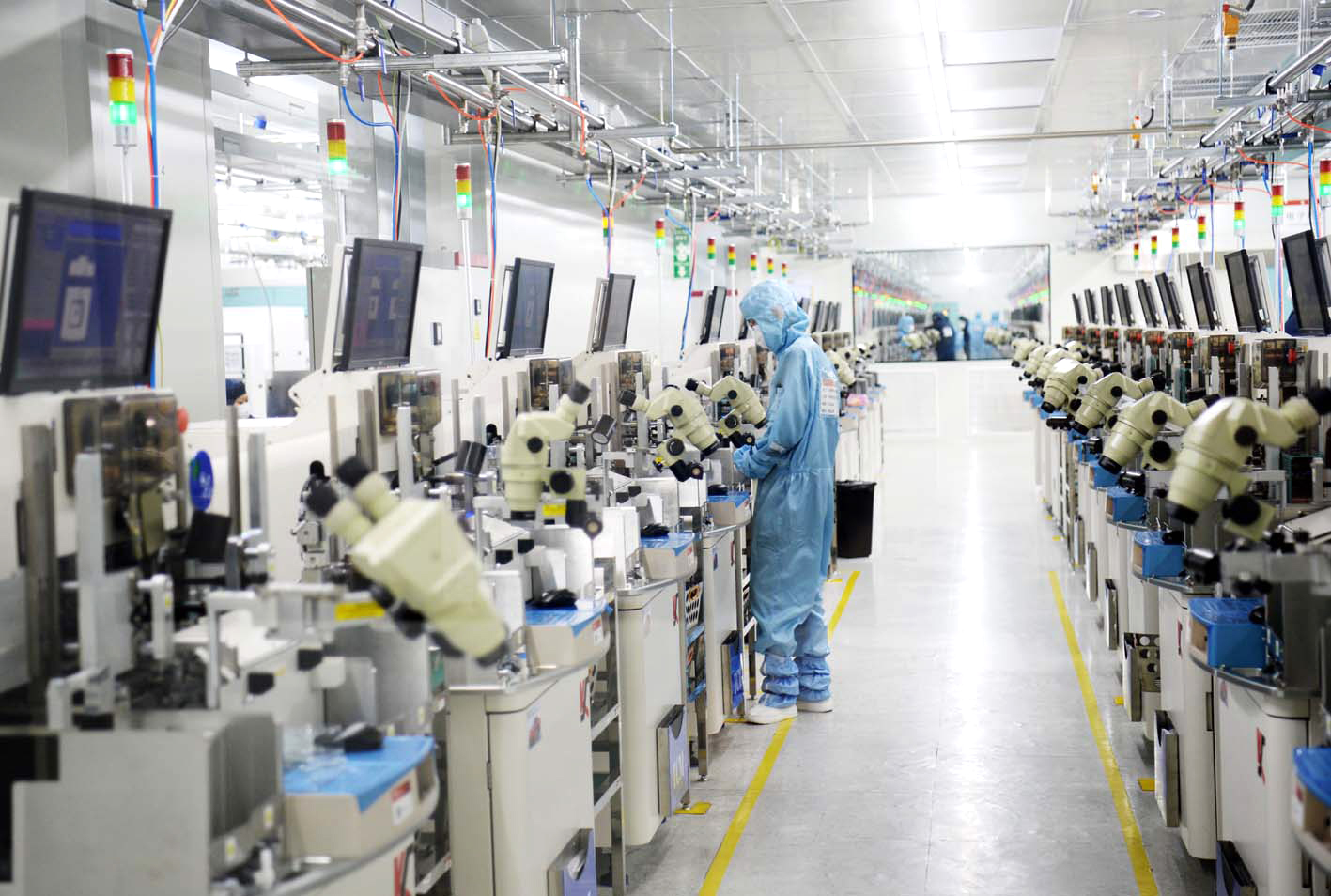 扬杰科技5号工厂洁净车间内,一排排智能化设备安静地生产,不时亮起指示灯,洋溢着新型工业化的静谧之美。