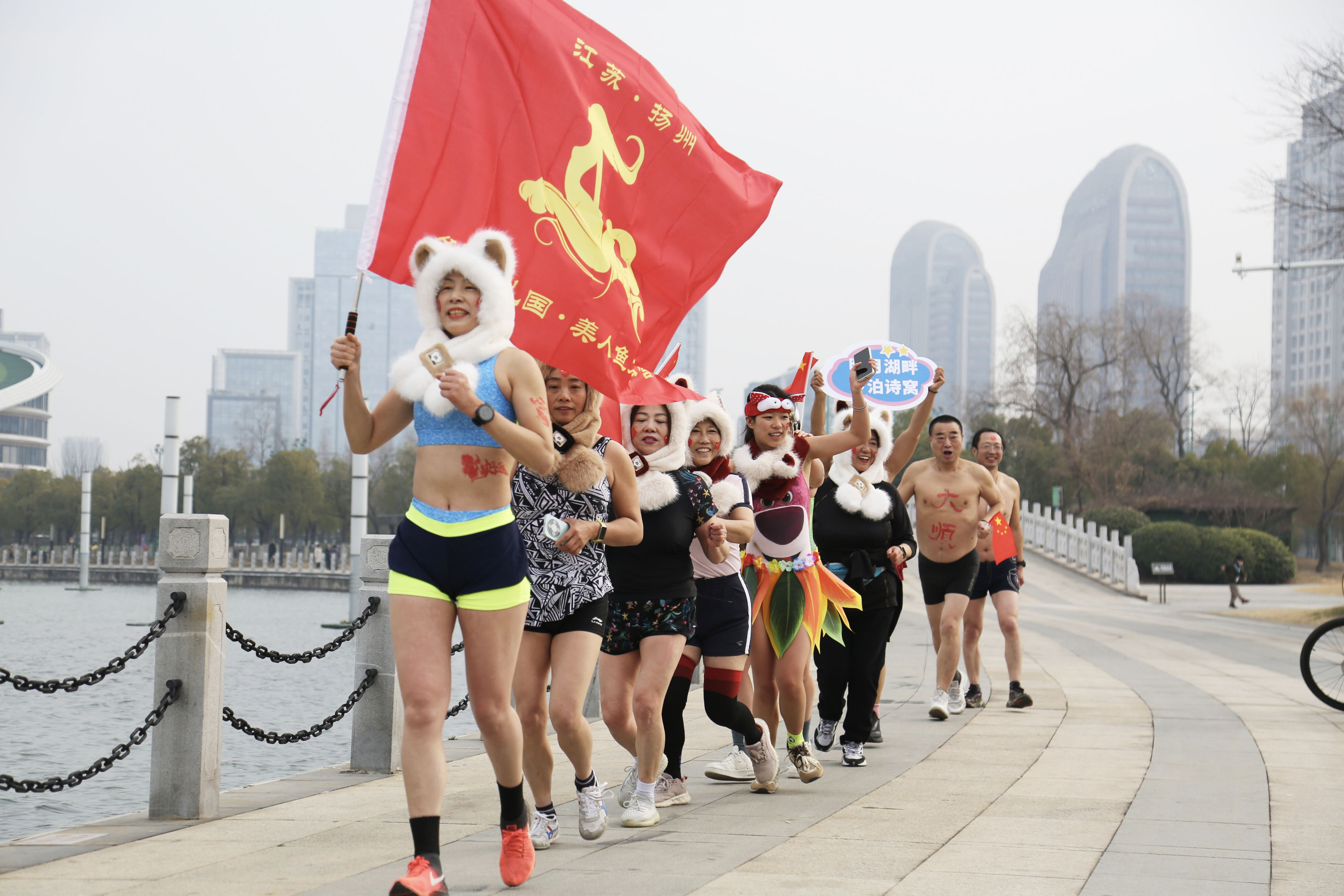 在奔跑的队伍中,有一支22人组成的“女儿国·美人鱼”队。她们是瘦西湖冬泳协会、经济开发区游泳协会和保障湖冬泳协会的冬泳爱好者。扬州的运河水里每天都有她们风雨无阻的冬泳身影。“美人鱼”们和其他协会的娘子军一起,成为奔跑队伍中令人瞩目的焦点。