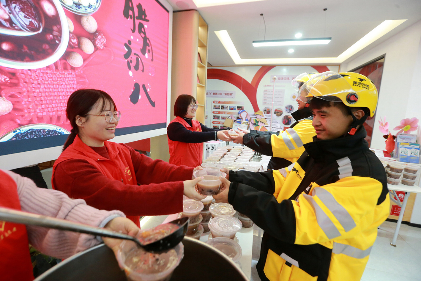 1月26日是农历腊月初八,是中国传统的“腊八节”,人们在这一天有喝腊八粥的习俗。1月26日,在扬州市徐凝门街社区,志愿者为外卖员送上腊八粥。
