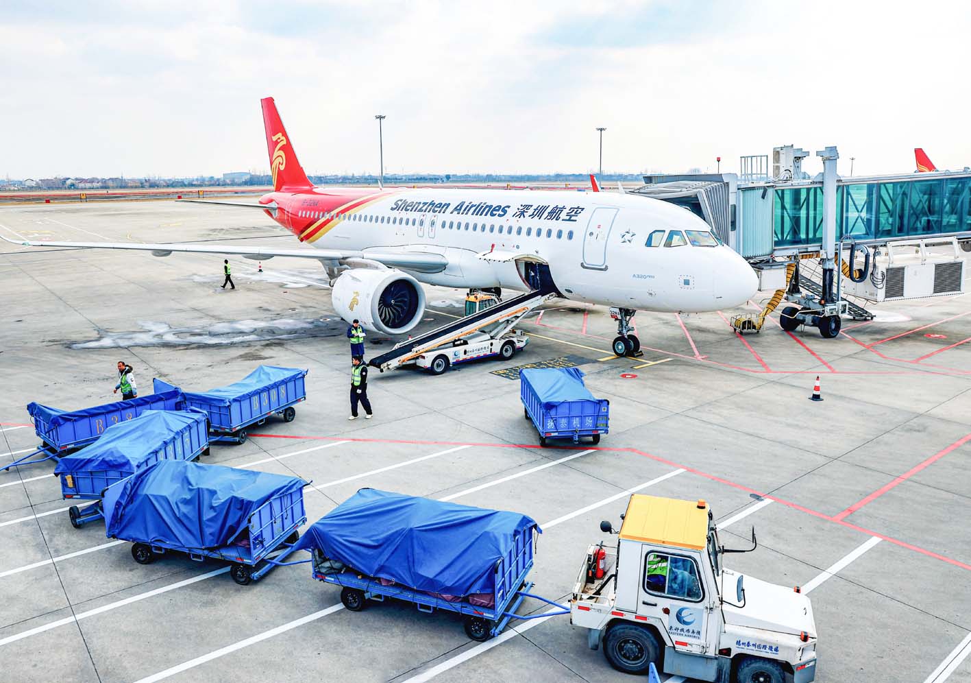 2026年春运将从2月2日开始,3月13日结束,共计40天。春运临近,扬州泰州国际机场旅客往来穿梭,一派繁忙景象。机场通过优化交通资源配置、科学安排人员班次等方式,进一步提升运输效率和服务质量,增强旅客获得感,为即将到来的春运保驾护航。图为1月28日,拖头车在机场运送货物。