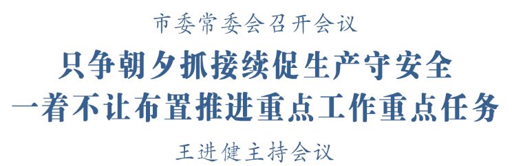 会议研究了2月份全市重点工作、1月份重点工作完成情况。会议指出,2月份有效工作时间较短,全市上下要只争朝夕抓接续、促生产、守安全,抓紧布置推进2026年重点工作、重点目标和重点项目,赶早多干,奋力实现一季度“开门红”。要更大力度稳增长、拓增量。抓好经济运行,锚定一季度目标精准发力,以最大努力争取更好结果;抓好消费挖潜,策划开展促消费活动,让群众放心消费、便利消费;抓好企业服务,做好政策宣传和诊断服务,保障好春节期间连续性生产企业,保障好节后复工复产、满产达产工作。要更优路径抓招商、攻项目。提升招商精准度,迅速掀起新春招商热潮,加快引进一批落地见效的优质项目;跑出建设加速度,压茬推进列省市重大项目,促进各类项目“齐头并进”;夯实储备支撑度,做好新一轮“两重”“两新”项目储备申报,更大力度激发民间投资活力。要更实举措解民忧、促稳定。妥善应对低温雨雪天气,加强独居老人、困难群体关爱帮扶;时刻绷紧安全之弦,坚决防范各类事故发生;扎实做好“三保”工作,努力把矛盾纠纷化解在萌芽状态。要更高标准强作风、严纪律。持续发力纠治“四风”问题,营造风清气正的政治生态,筑牢廉洁自律思想防线,以优良作风推动各项工作取得新突破。
