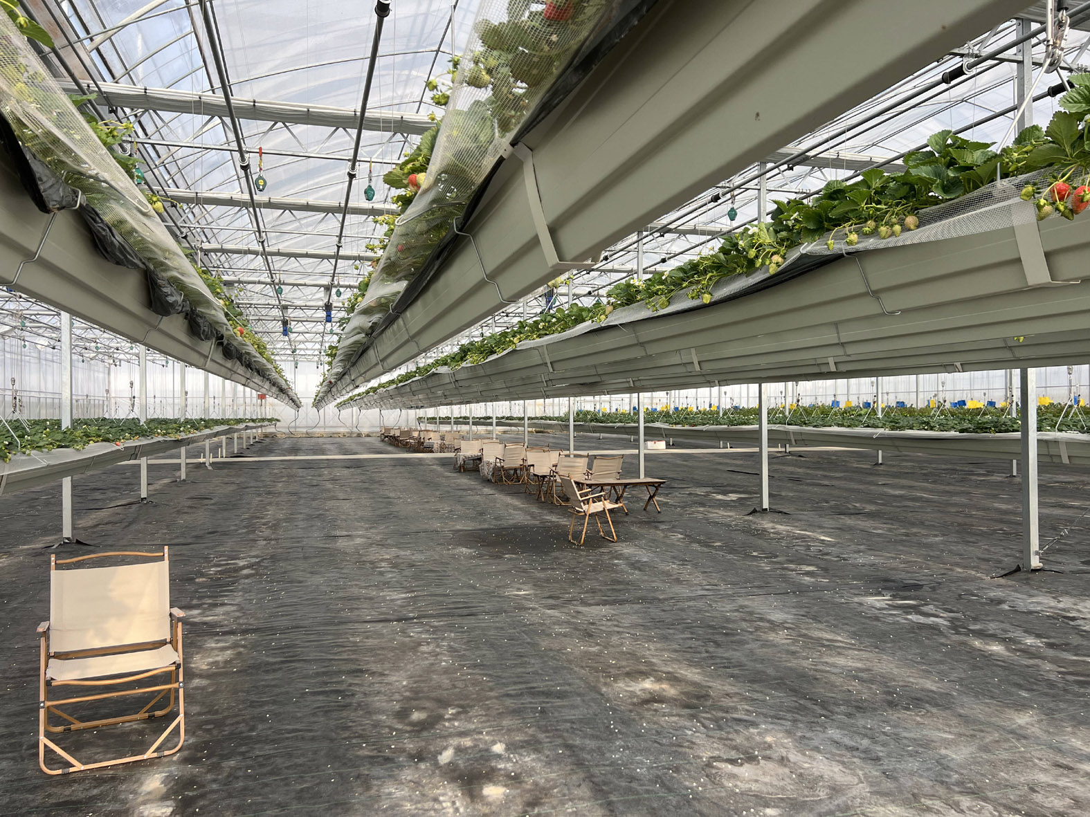 让草莓离开地面,向上生长,在铁架或高槽中种植,如今已不罕见。但在这里,连固定的支架都“消失”了——只见从大棚顶部垂下一根根钢丝,稳稳吊起一排排种植槽,槽内填着特制基质,草莓就在这“空中吊床”上舒展生长。