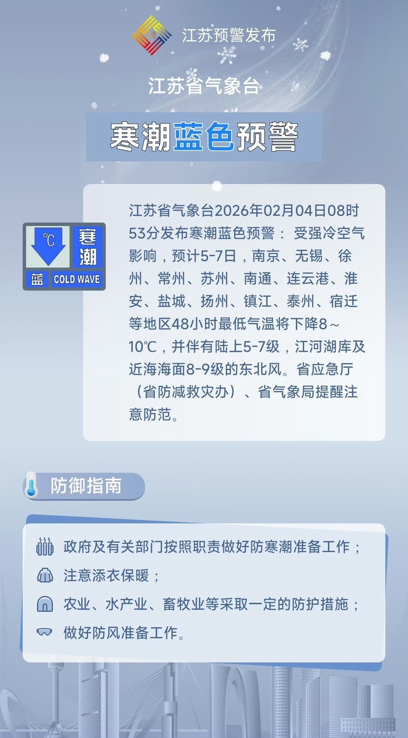 交汇点讯 江苏省气象台2026年02月04日08时53分发布寒潮蓝色预警: