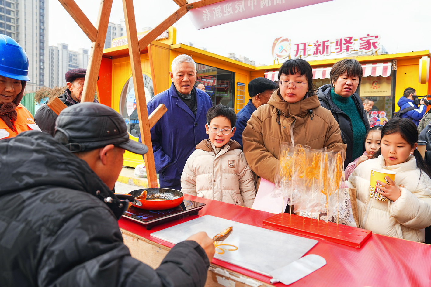好物区热闹非凡,其他区域也毫不逊色。体验区里,年蒸、糖葫芦DIY吸引了不少家庭参与,还有师傅现场制作糖画,甜滋滋的糖浆在石板上勾勒出龙凤、十二生肖等图案,让居民在感受传统年俗的同时,收获了满满的乐趣。